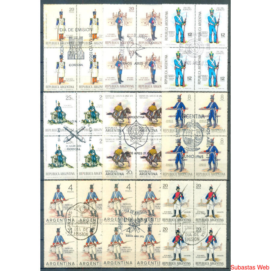 ARGENTINA. MILITARÍA - SOLDADOS - UNIFORMES. 9 CUADRITOS DE LA SERIE SOLDADOS ARGENTINOS. CON MATASELLOS PRIMER DÍA DE EMISIÓN. (1 es sin goma)
