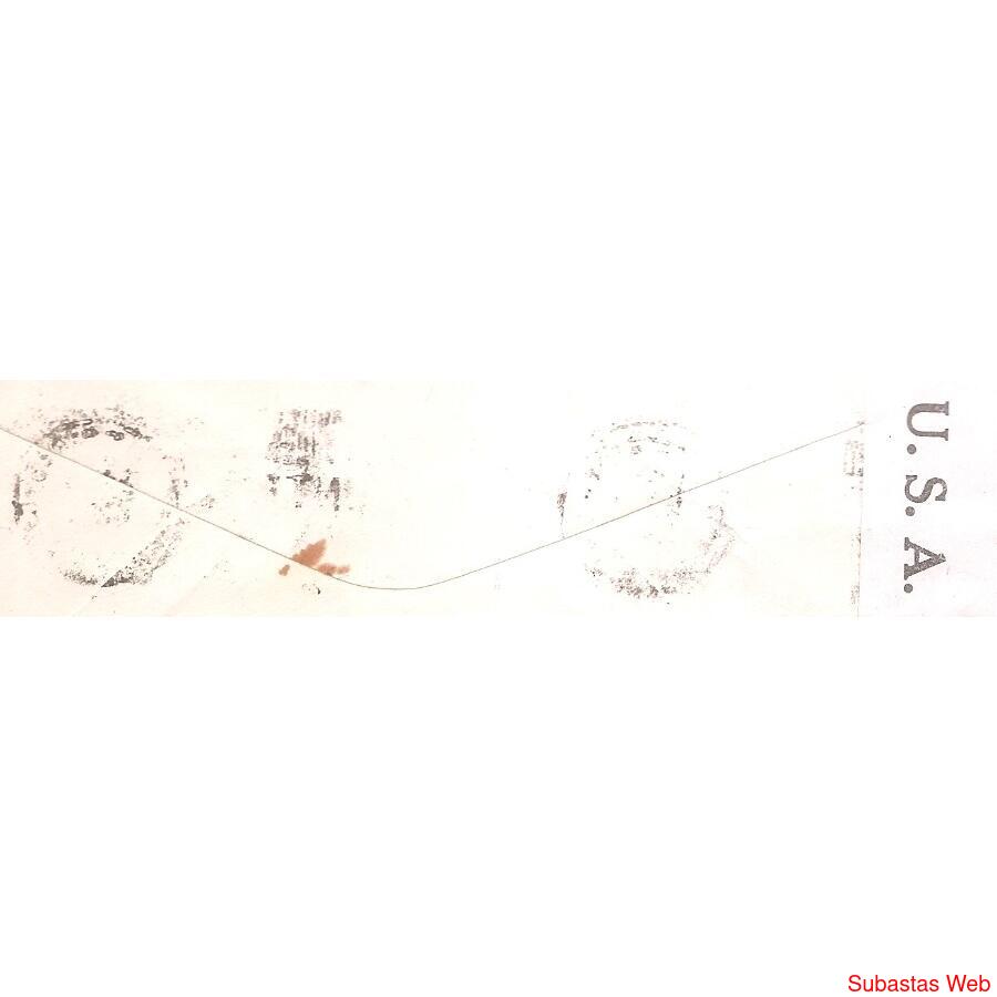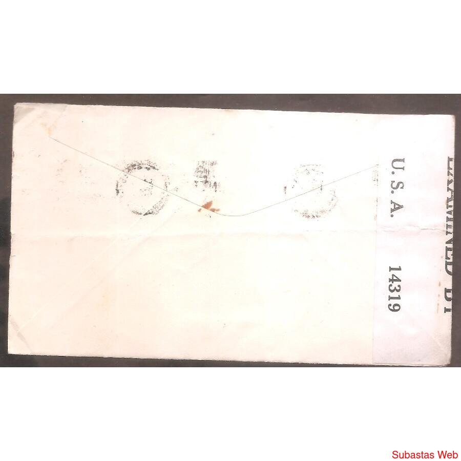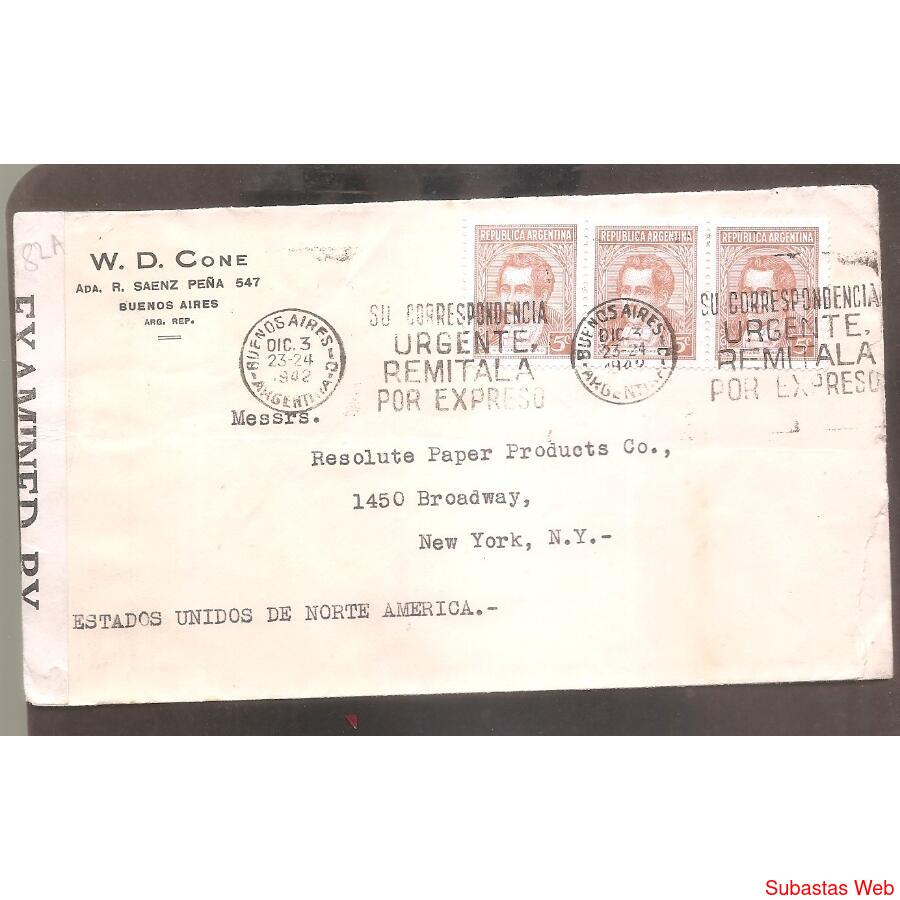 SOBRE CIRCULADO DE BUENOS AIRES A NUEVA TORK ESTADOS UNIDOS, EL 3 DE DICIEMBRE DE 1942, FRANQUEO: 3 ESTAMPILLAS DE MORENO DE 5ctvs PROCERES Y RIQUEZAS., MATASELLO DE BUENOS AIRES CON BANDELETA. DORSO 2 MATASELLOS BORROSOS -SOBRE EXAMINADO EN USA