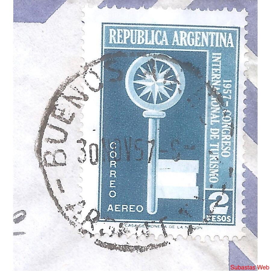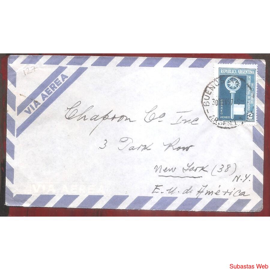 SOBRE CIRCULADO DE BUENOS AIRES A NUEVA YORK – ESTADOS UNIDOS, EL 30 DE NOVIEMBRE DE 1957, FRANQUEO: CONGRESO INTERNACIONAL DEL TURISMO, MATASELLO DE BUENOS AIRES, AL DORSO REMITENTE