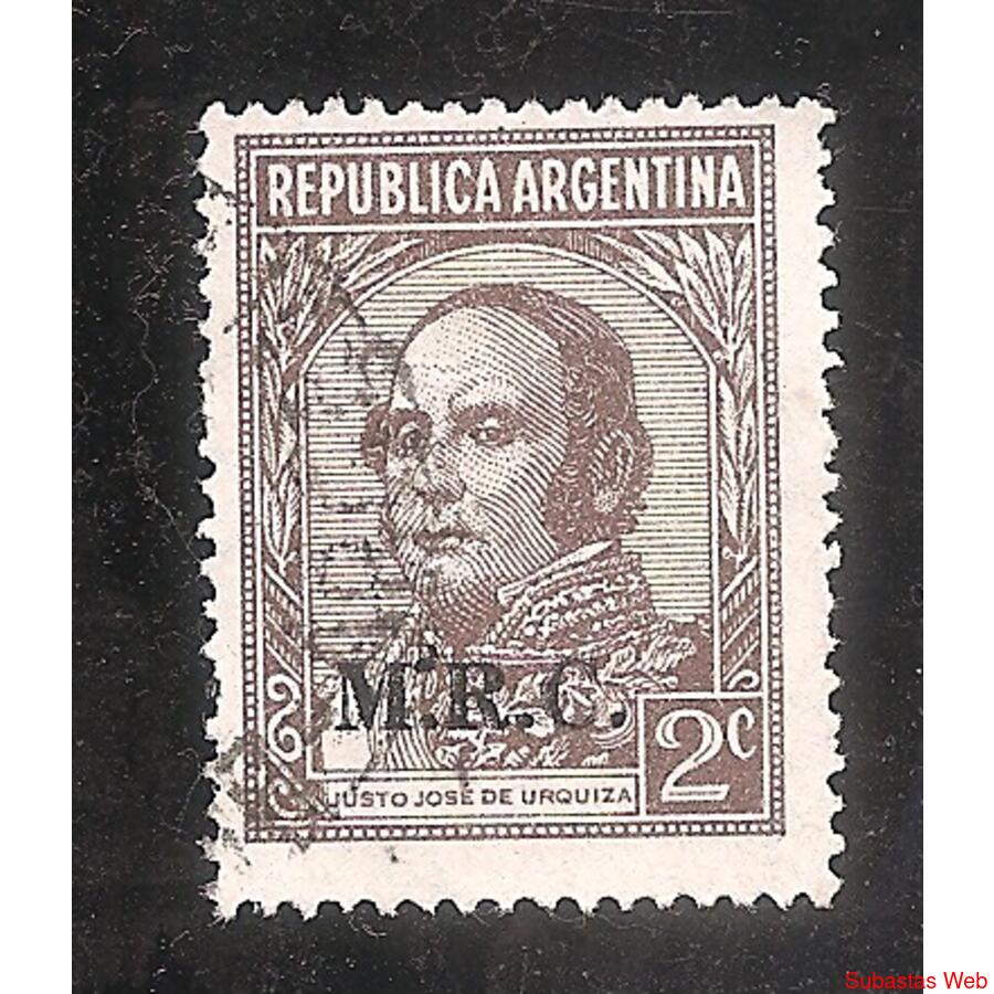 ARGENTINA 1935 CORREO ORDINARIO PROCERES Y RIQUEZAS NACIONALES: URQUIZA , FILIGRANA SOL RA CON RAYOS ONDULADOS, SOBRACARGA M.R.C. USADA, NROCAT: MT: 365(329)