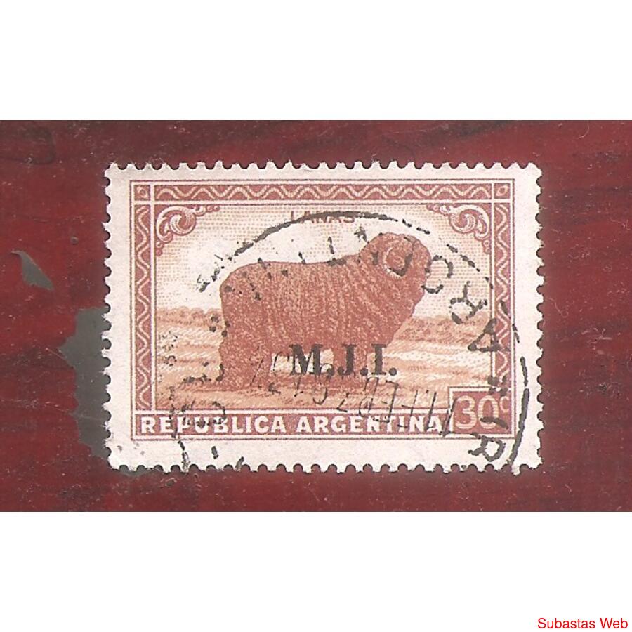 ARGENTINA 1935 CORREO ORDINARIO PROCERES Y RIQUEZAS NACIONALES: OBEJA, FILIGRANA SOL RA CON RAYOS ONDULADOS, SOBRECARGA MINISTERIAL: M.J.I. USADA, NROCAT: MT377(308)