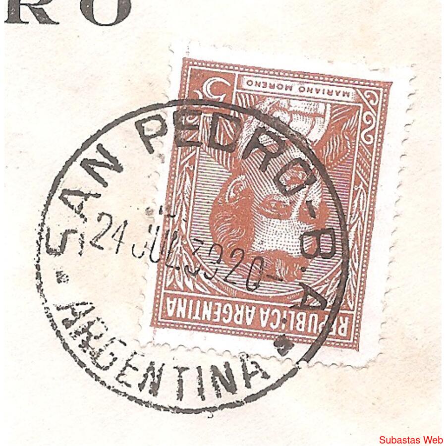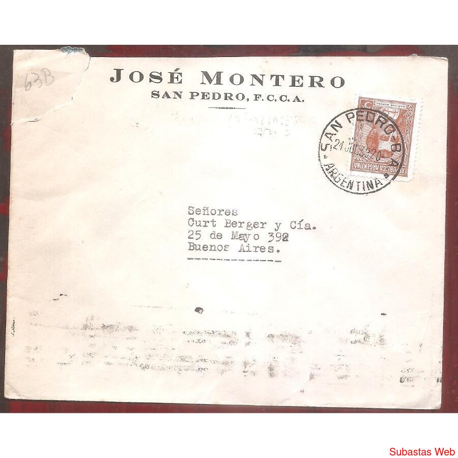Sobre Circulado el 21 DE JULIO de 1939 de SAN PEDRO,PROVINCIA DE BUENOS AIRES A CAPITAL FEDERAL FRANQUEO: PROCERES Y RIQUEZAS, MORENO DE 5ctvs. Matasellos al frente DE SAN PEDRO AL DORDO 2MATASELLO DE BUENOS AIRES CON BANDELETA: 25-7-39, SOBRE MEMBRETADO DE JOSE MONTERO