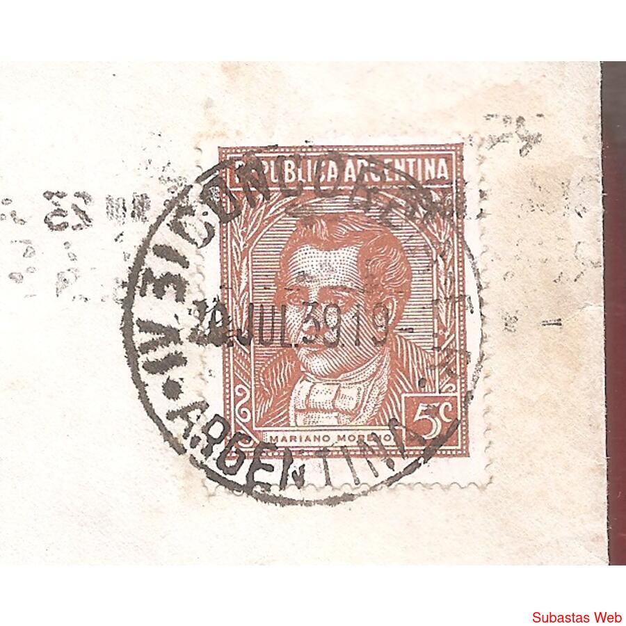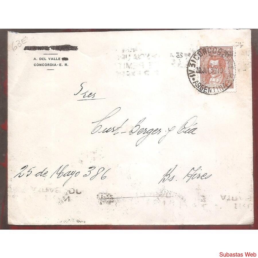Sobre Circulado el 20 DE JULIO de 1939 de CONCORDIA ENTRE RIOS A BUENOS AIRES CAPITAL FEDERAL FRANQUEO: PROCERES Y RIQUEZAS, MORENO DE 5ctvs. Matasellos al frente DE CONCORDIA AL DORDO 3 BUENOS MATASELLO DE BUENOS AIRES CON BANDELETA: 23-7-39,