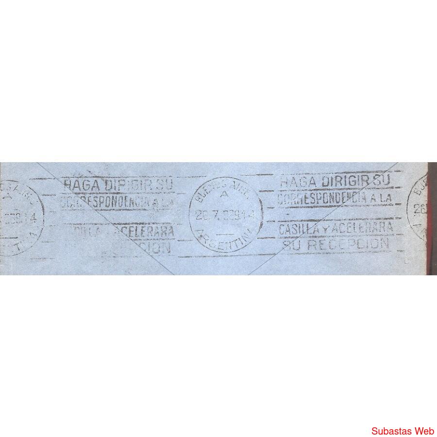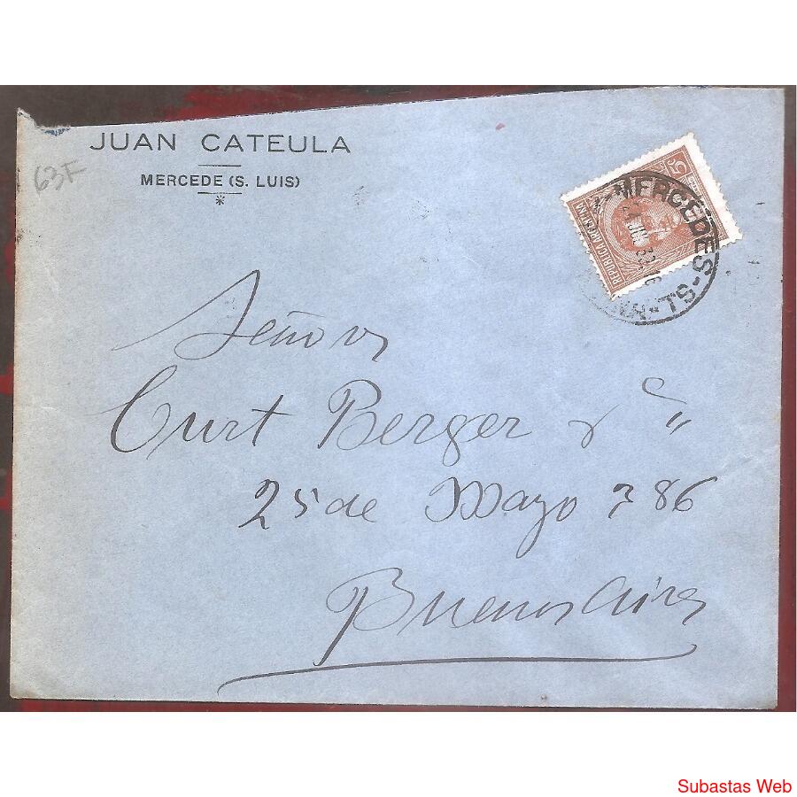 Sobre Circulado el 24 DE JULIO de 1939 de MERCEDES SAN LUIS A BUENOS AIRES CAPITAL FEDERAL FRANQUEO: PROCERES Y RIQUEZAS, MORENO DE 5ctvs. Matasellos al frente DE MERCEDES AL DORDO MATASELLO DE BUENOS AIRES CON BANDELETA: 23-7-39, SOBRE MEMBRETADO: JUAN CATEULA