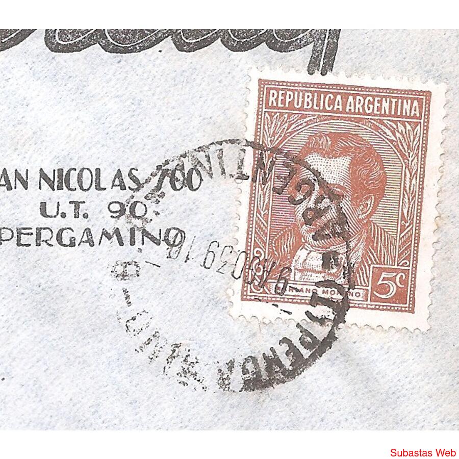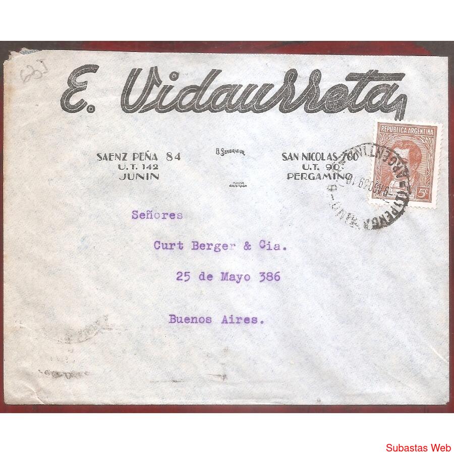 Sobre Circulado el 9 DE AGOSTO de 1939 de PERGAMINO A BUENOS AIRES CAPITAL FEDERAL FRANQUEO: PROCERES Y RIQUEZAS, MORENO DE 5ctvs. Matasellos al frente DE PERGAMINO AL DORDO MATASELLO DE BUENOS AIRES CON BANDELETA: 29-7-39, SOBRE MEMBRETADO: E. VIDAURRETA