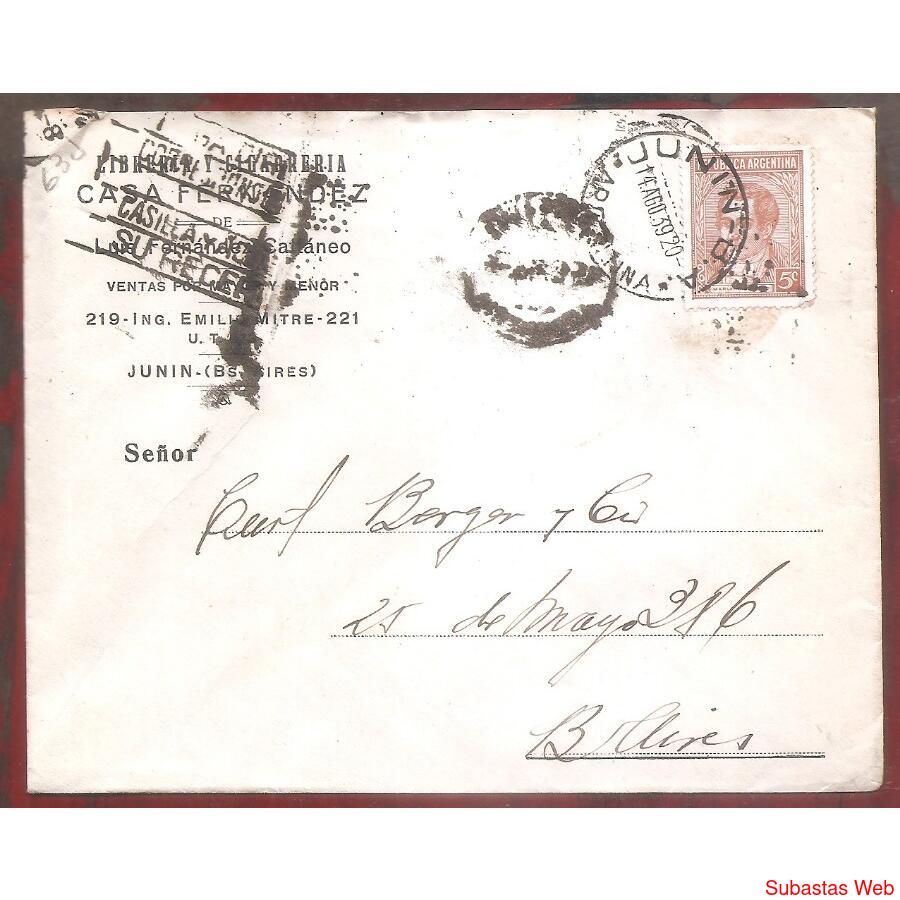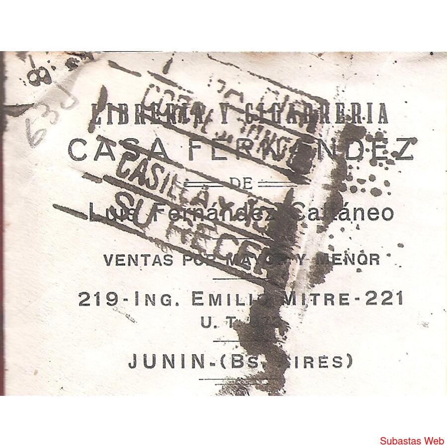 Sobre Circulado el 14 DE AGOSTO de 1939 de JUNIN A BUENOS AIRES CAPITAL FEDERAL FRANQUEO: PROCERES Y RIQUEZAS, MORENO DE 5ctvs. Matasellos al frente DE JUNIN AL DORDO MATASELLO DE BUENOS AIRES CON BANDELETA: 9-8-39, SOBRE MEMBRETADO: LIBRERIA I CIGARRERIA CASA FERNANDEZ