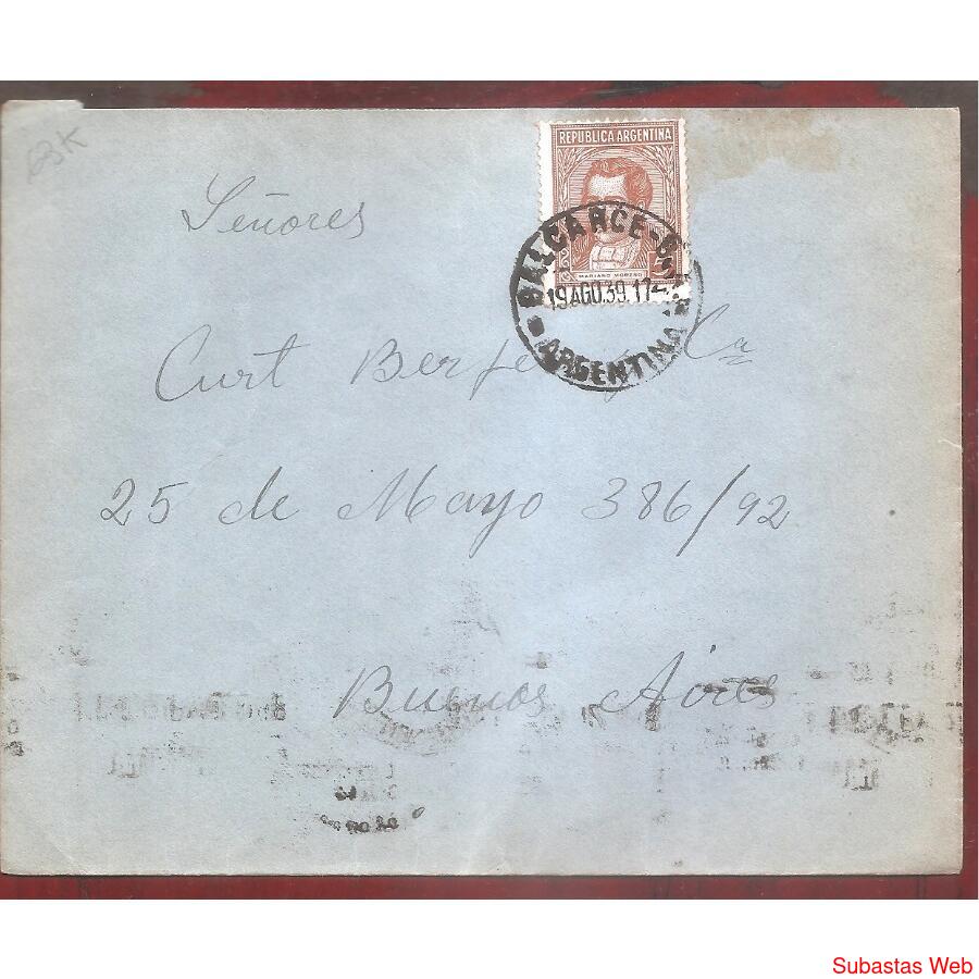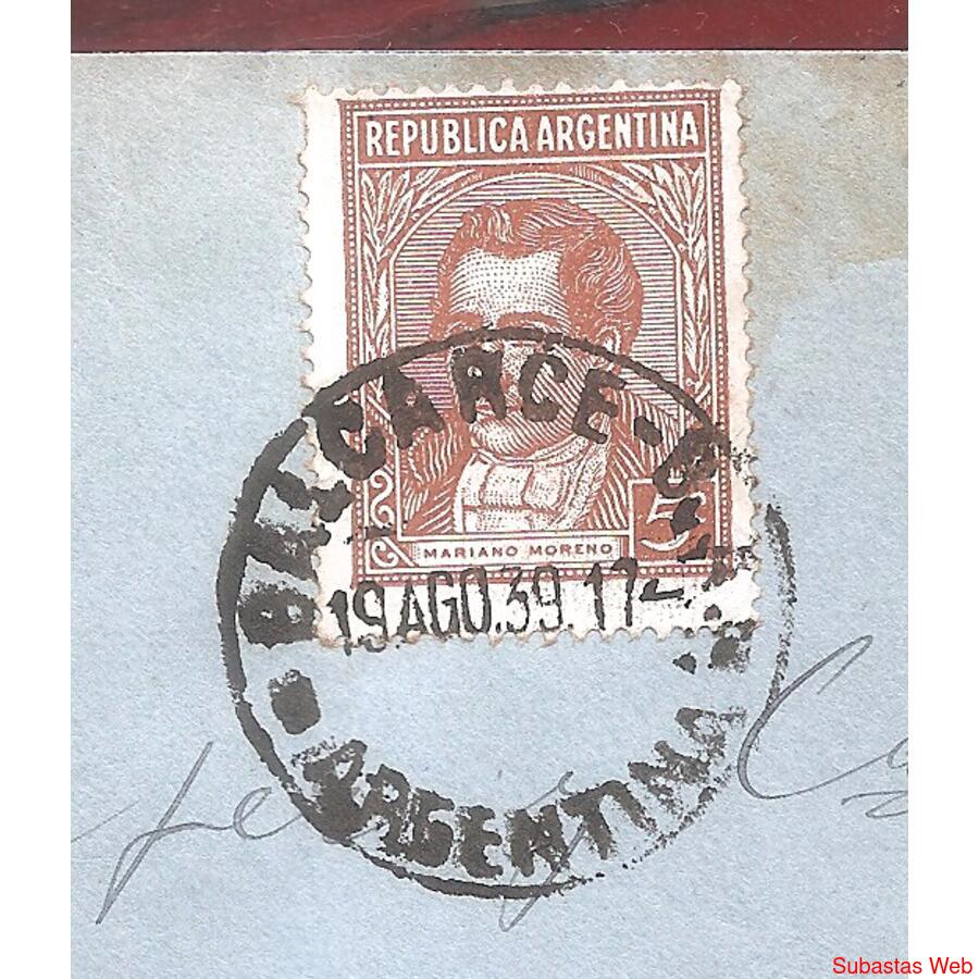 Sobre Circulado el 19 DE AGOSTO de 1939 de BALCARCE A BUENOS AIRES CAPITAL FEDERAL FRANQUEO: PROCERES Y RIQUEZAS, MORENO DE 5ctvs. Matasellos al frente DE BALCARCE AL DORDO 2 MATASELLOS DE BUENOS AIRES CON BANDELETA: 20-8-39,