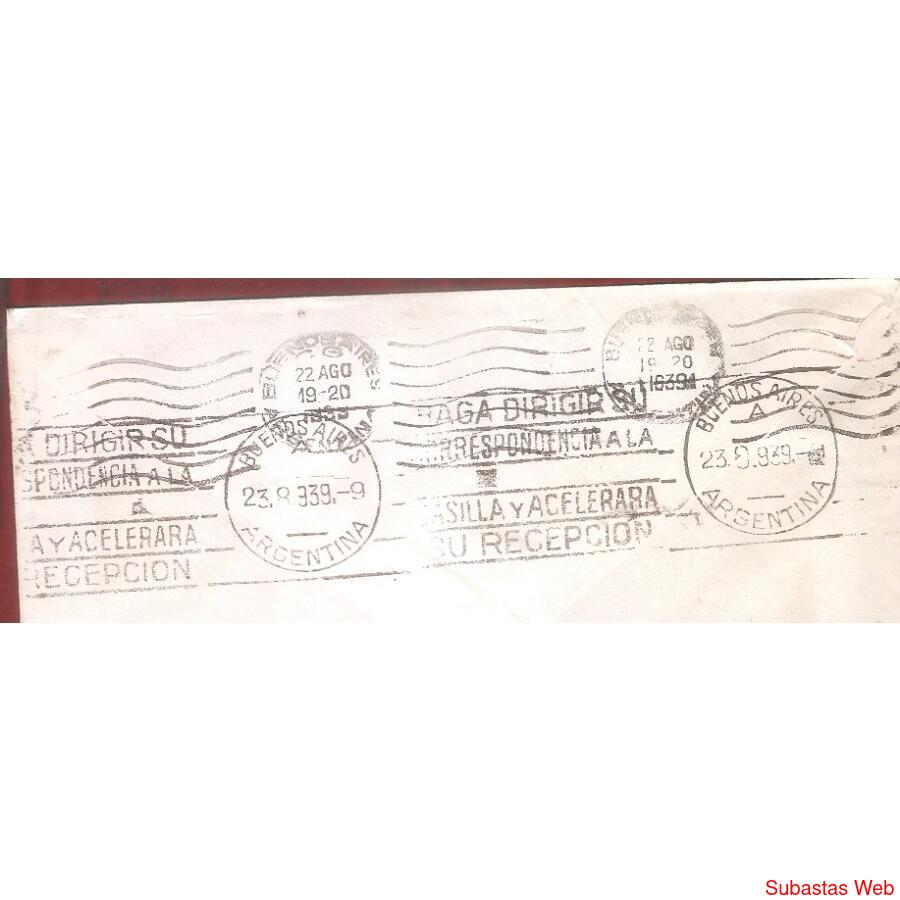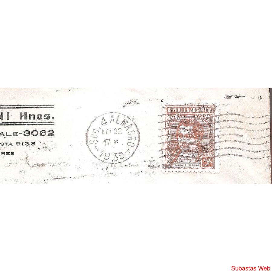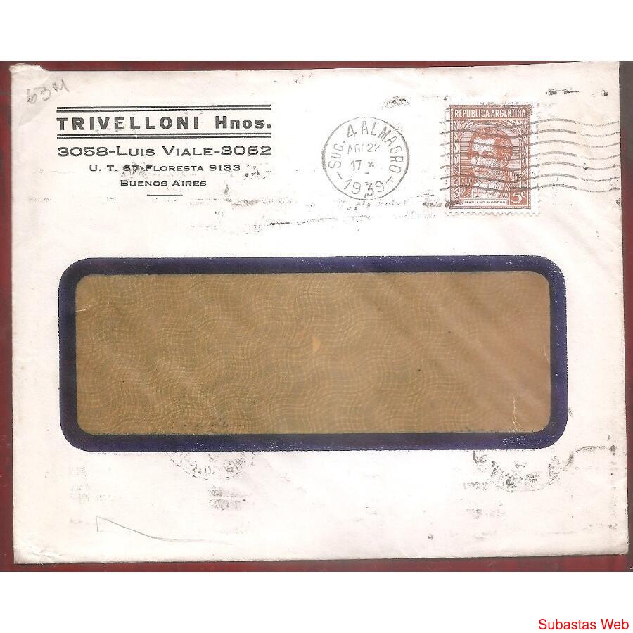 Sobre Circulado el 22 DE AGOSTO de 1939 de SUCURSAL ALMAGRO (CAPITAL) A BUENOS AIRES CAPITAL FEDERAL FRANQUEO: PROCERES Y RIQUEZAS, MORENO DE 5ctvs. Matasellos al frente DE SUCURSAL ALMAGRO AL DORDO 3 MATASELLOS DE BUENOS AIRES CON BANDELETA: 23-8-39, SOBRE MEMBRETADO: TRIVELLONI HNOS.