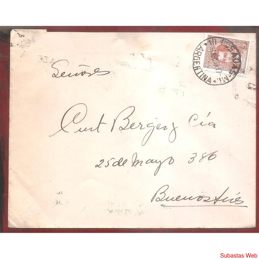 Sobre Circulado el 24 DE AGOSTO de 1939 de POSADAS – MISIONES A BUENOS AIRES CAPITAL FEDERAL FRANQUEO: PROCERES Y RIQUEZAS, MORENO DE 5ctvs. Matasellos al frente DE POSADAS AL DORSO MATASELLOS DE BUENOS AIRES CON BANDELETA: 26-8-39,