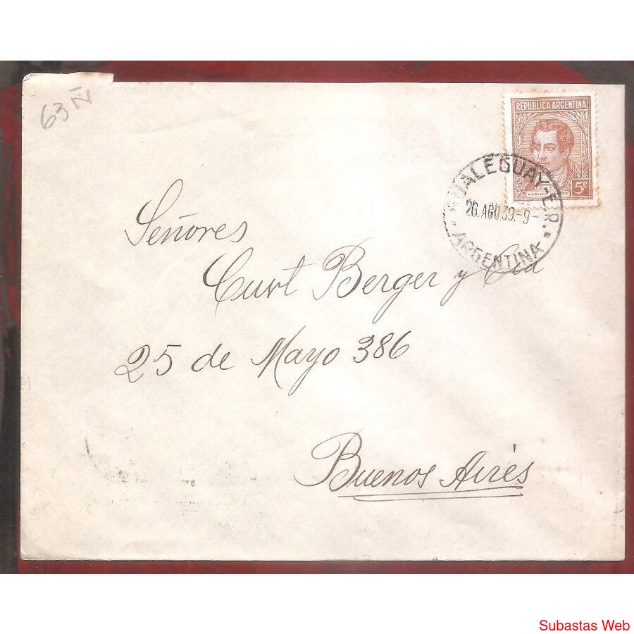 ARGENTINA 1939 SOBRE CIRCULADO NUMERO 63Ñ