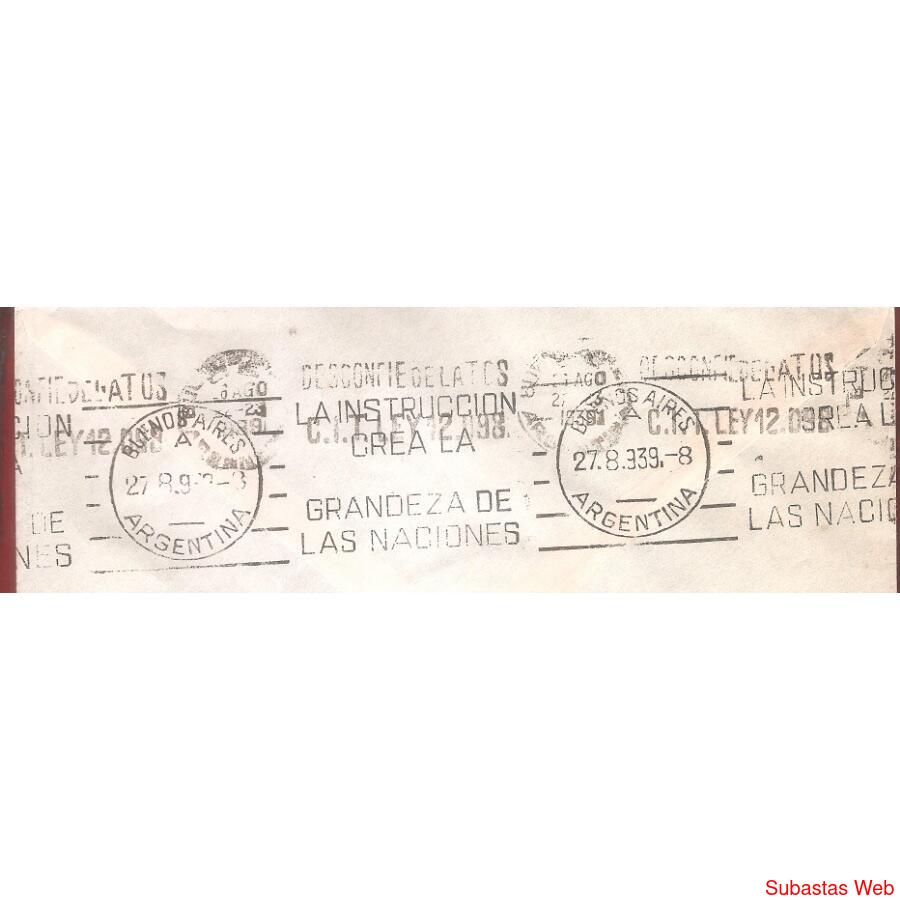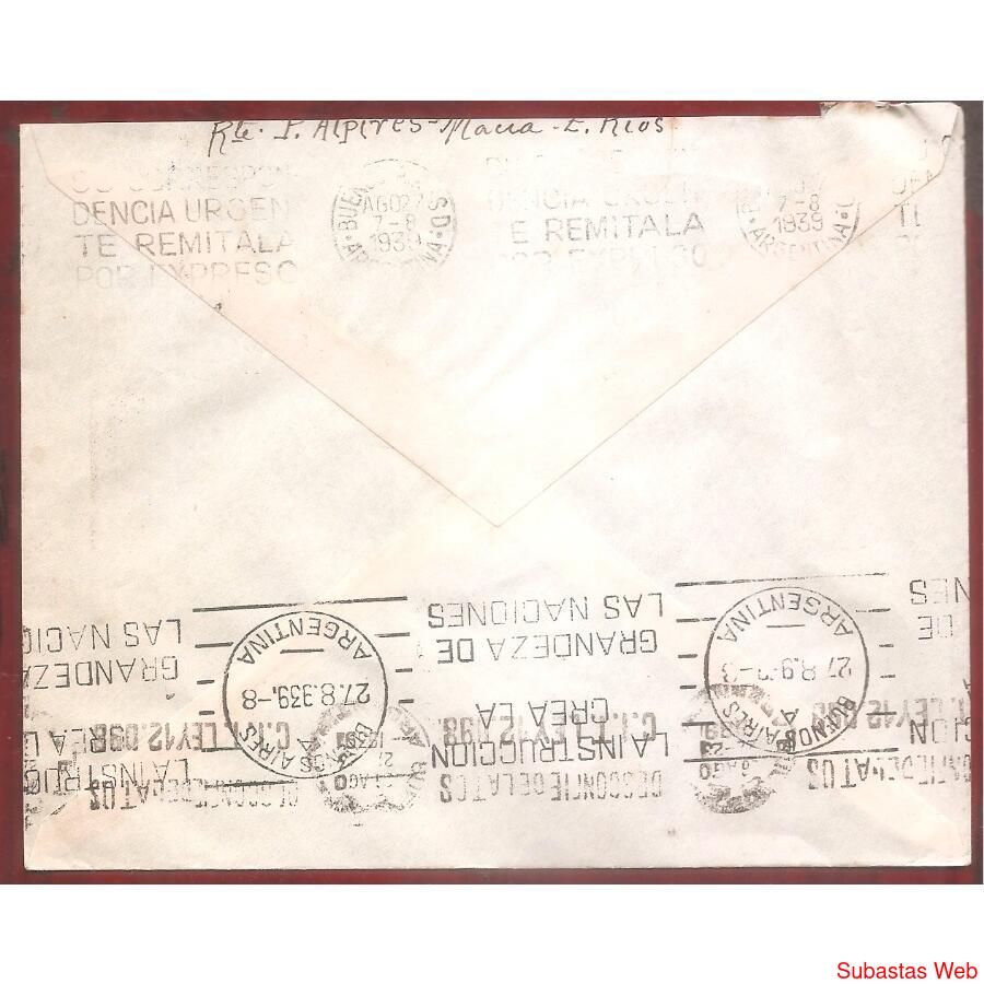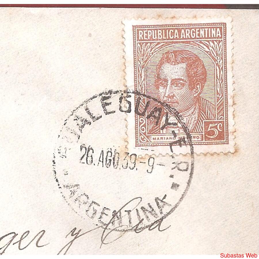 Sobre Circulado el 26 DE AGOSTO de 1939 de GUALEGUAY – ENTRE RIOS A BUENOS AIRES CAPITAL FEDERAL FRANQUEO: PROCERES Y RIQUEZAS, MORENO DE 5ctvs. Matasellos al frente DE GUALEGUAY AL DORDO MATASELLOS DE BUENOS AIRES CON BANDELETA: 27-8-39,