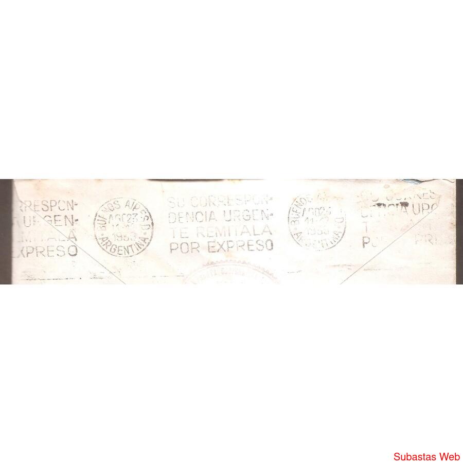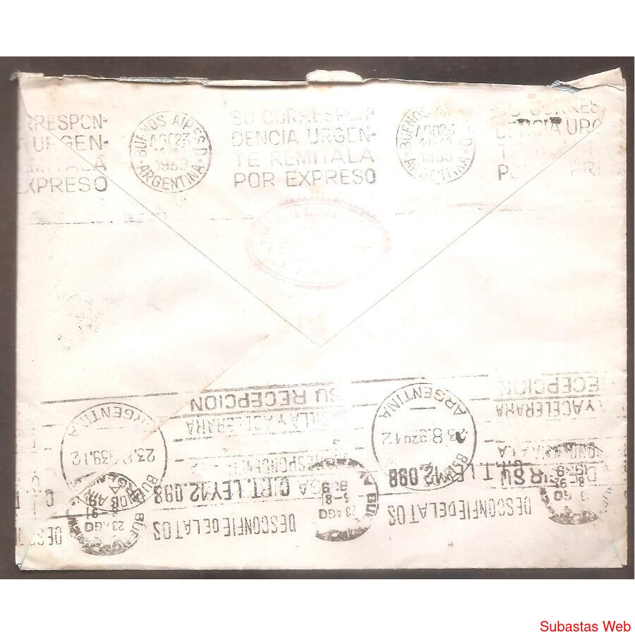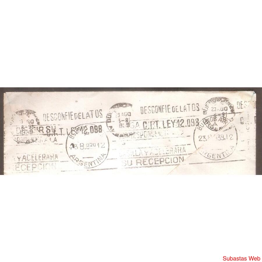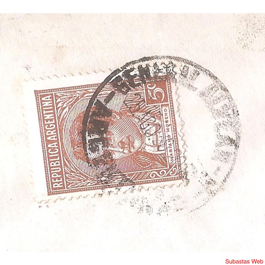 Sobre Circulado el 23 DE AGOSTO de 1939 de LA PAZ- A BUENOS AIRES CAPITAL FEDERAL FRANQUEO: PROCERES Y RIQUEZAS, MORENO DE 5ctvs. Matasellos al frente DE LA PAZ, AL DORDO 2 MATASELLOS DE BUENOS AIRES CON BANDELETA: 23-8-39,