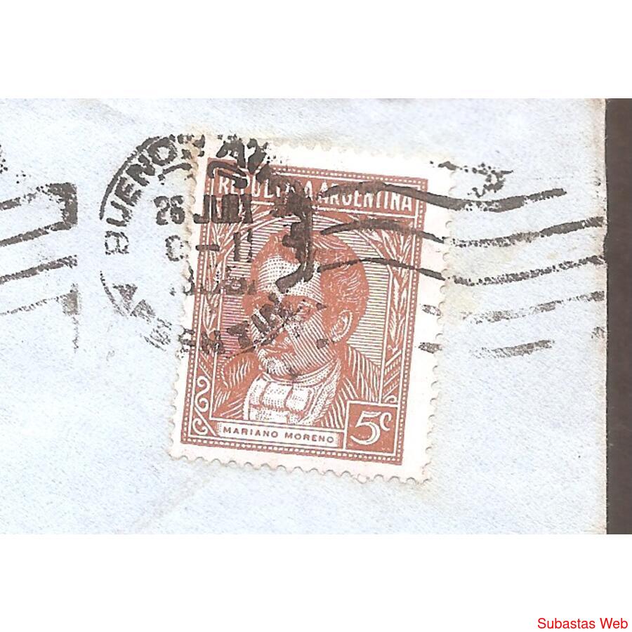 Sobre Circulado el 26 DE JULIO de 1939 DENTRO DE BUENOS AIRES, FRANQUEO: PROCERES Y RIQUEZAS, MORENO DE 5ctvs. Matasellos al frente BANDELETA DE BUENOS AIRES, AL DORDO 2 MATASELLOS DE BUENOS AIRES CON BANDELETA: