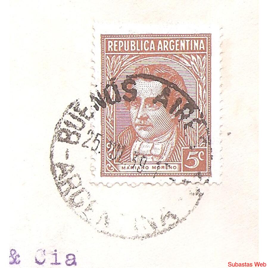 Sobre Circulado el 25 DE JULIO de 1939 DENTRO DE BUENOS AIRES, FRANQUEO: PROCERES Y RIQUEZAS, MORENO DE 5ctvs. Matasellos al frente DE BUENOS AIRES, AL DORDO 2 MATASELLOS DE BUENOS AIRES CON BANDELETA: