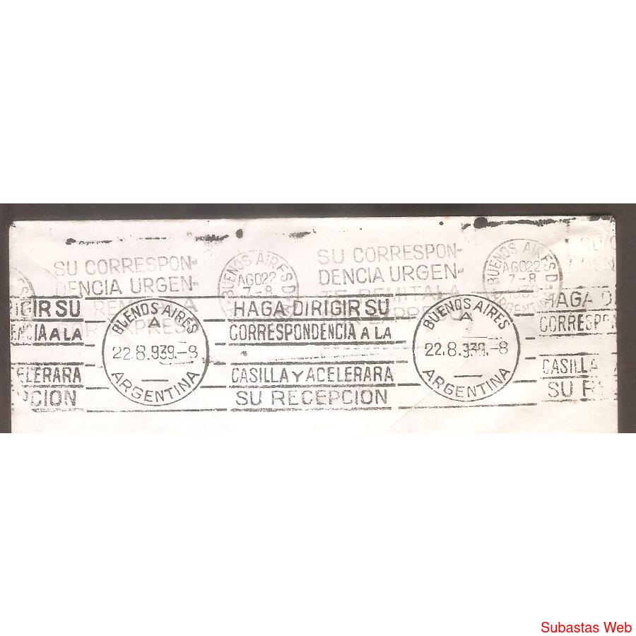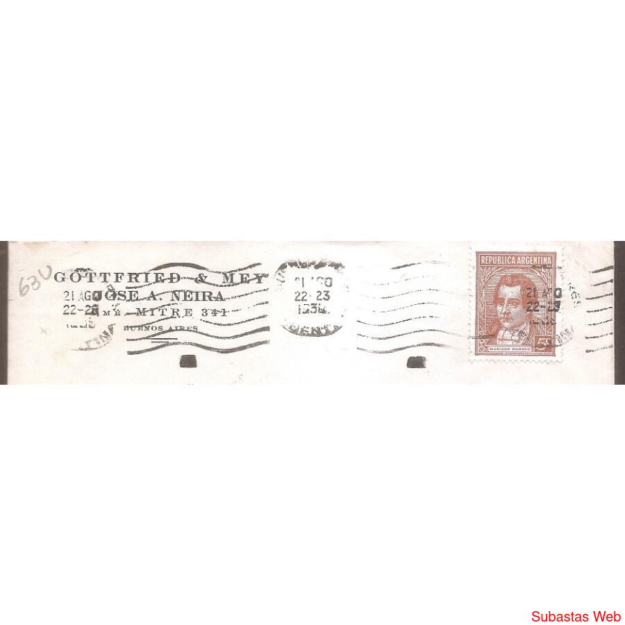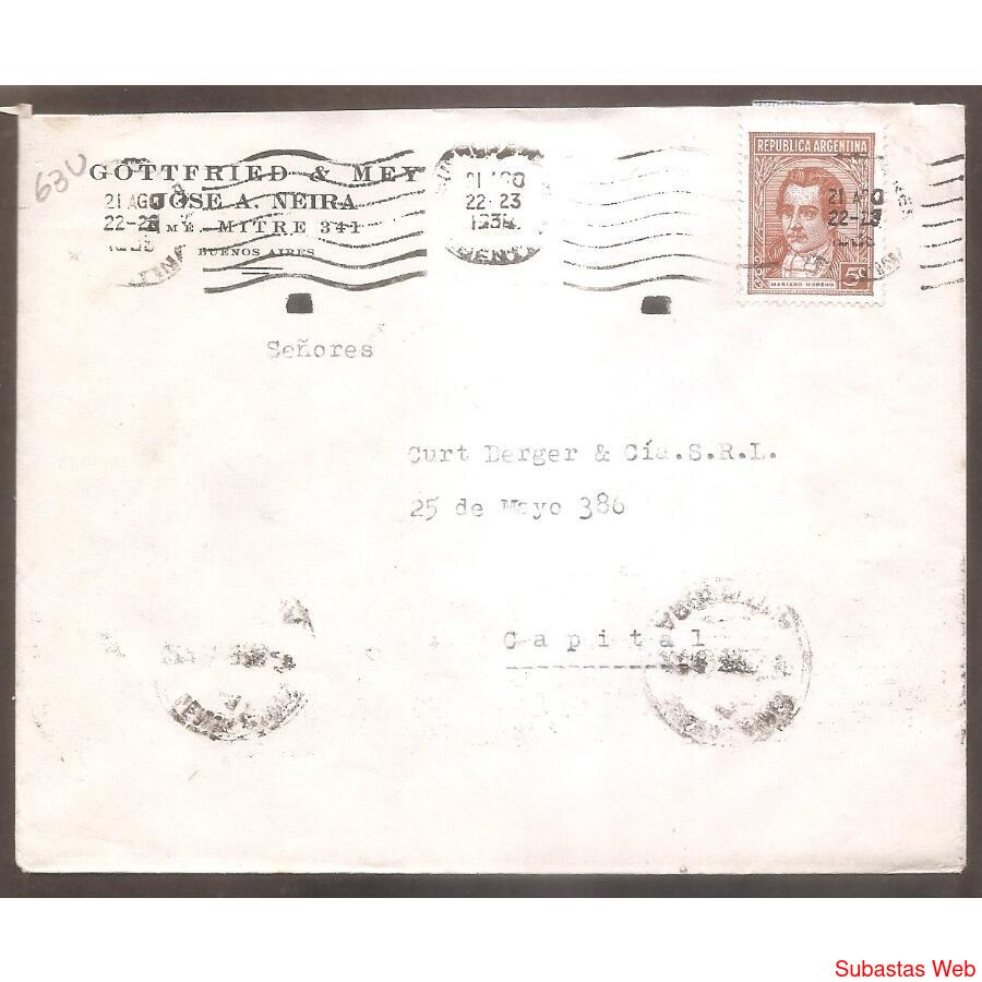 Sobre Circulado el 22 DE AGOSTO de 1939 DENTRO DE BUENOS AIRES, FRANQUEO: PROCERES Y RIQUEZAS, MORENO DE 5ctvs. Matasellos al frente DE BUENOS AIRES CON BANDELETA, AL DORDO 2 MATASELLOS DE BUENOS AIRES CON BANDELETA: