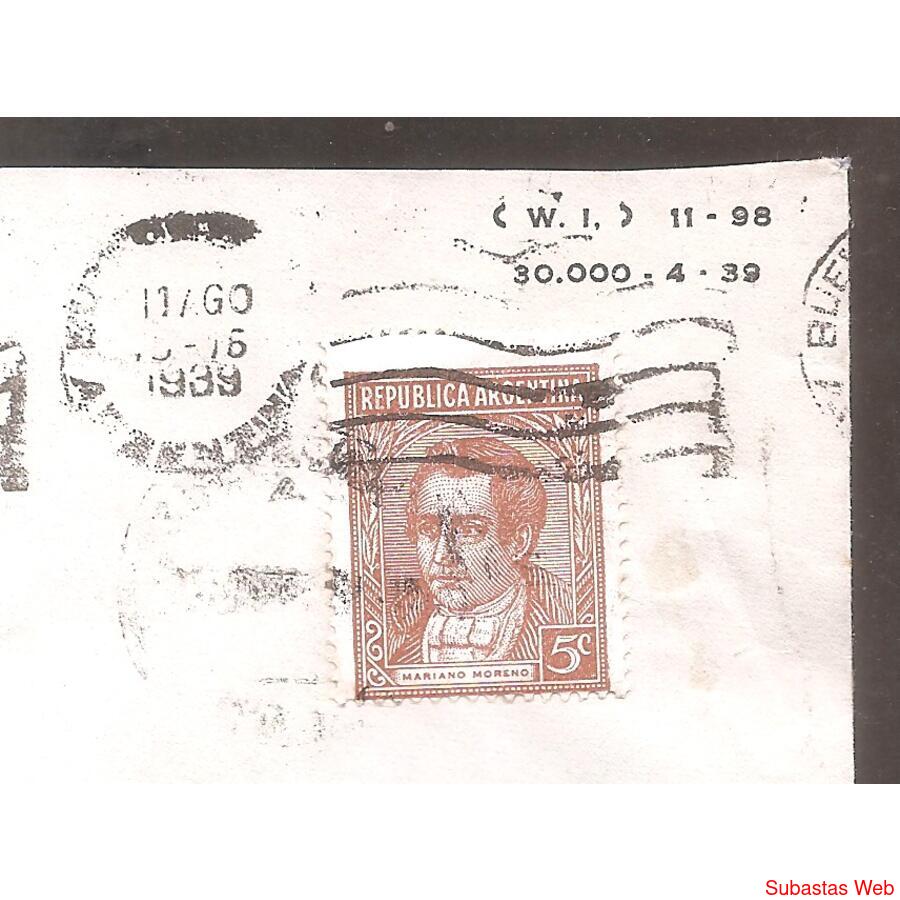 Sobre Circulado el 23 DE AGOSTO de 1939 DENTRO DE BUENOS AIRES, FRANQUEO: PROCERES Y RIQUEZAS, MORENO DE 5ctvs. Matasellos al frente DE BUENOS AIRES CON BANDELETA, AL DORDO MATASELLOS DE BUENOS AIRES CON BANDELETA: