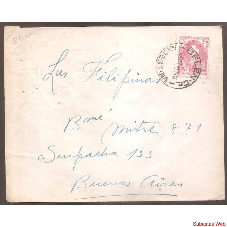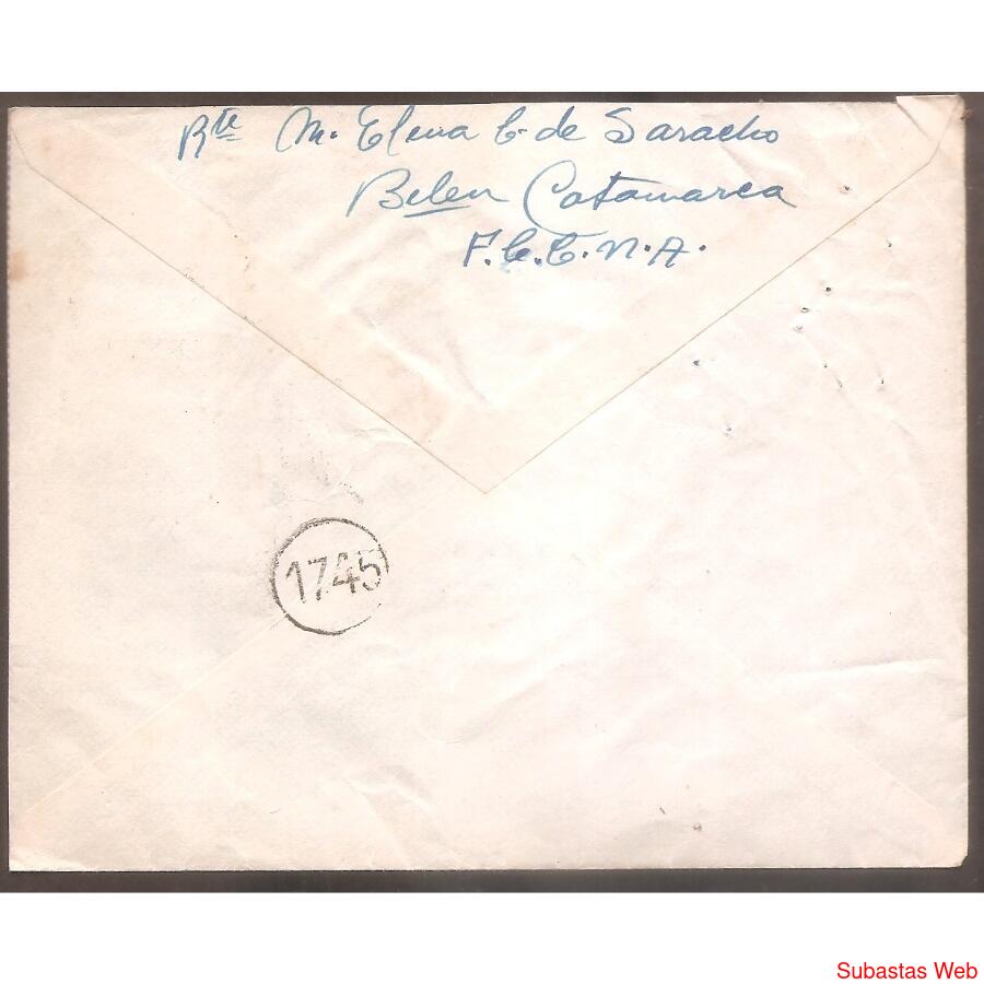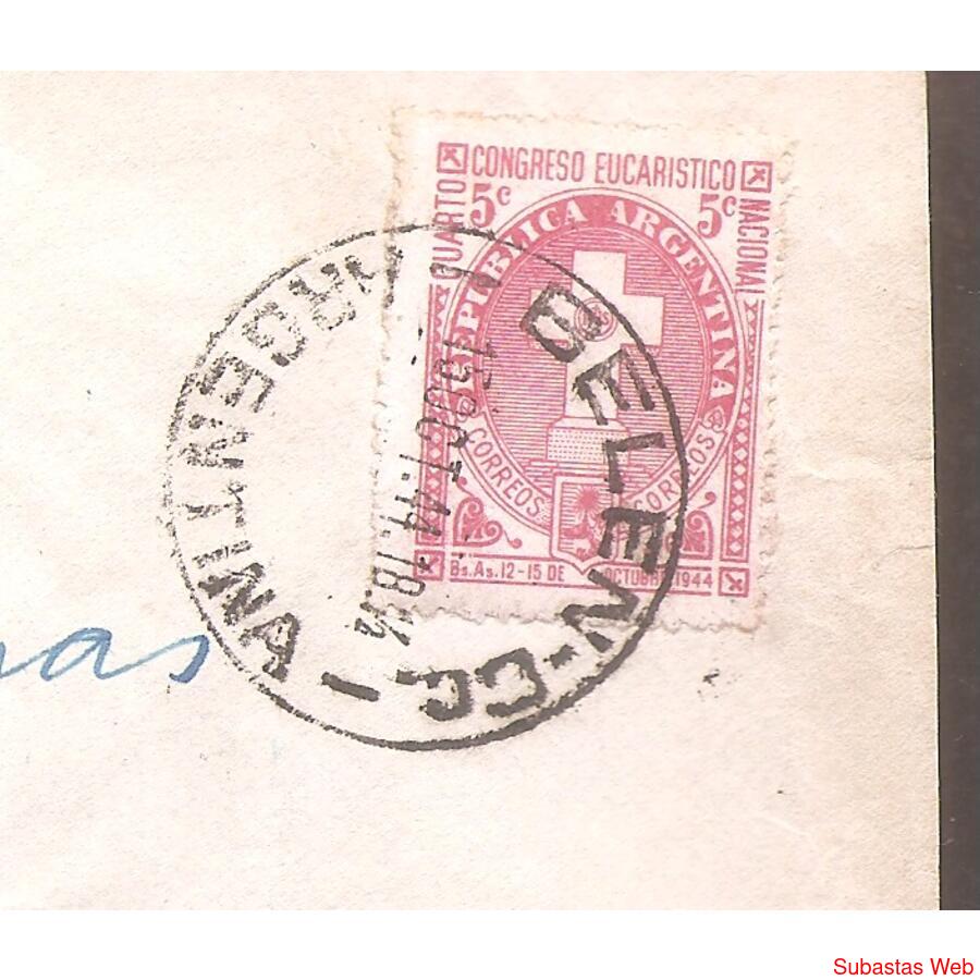 SOBRE CIRCULADO EL 15 DE OCTUBRE DE 1944, DE BELEN -CORDOBA- A BUENOS AIRES – CAPITAL- FRANQUEO: CONGRESO AUCARISTICO NACIONAL, MATASELLO DE BELEN AL DORSO UN SELLO REDONDO CON EL NUMERO 1745