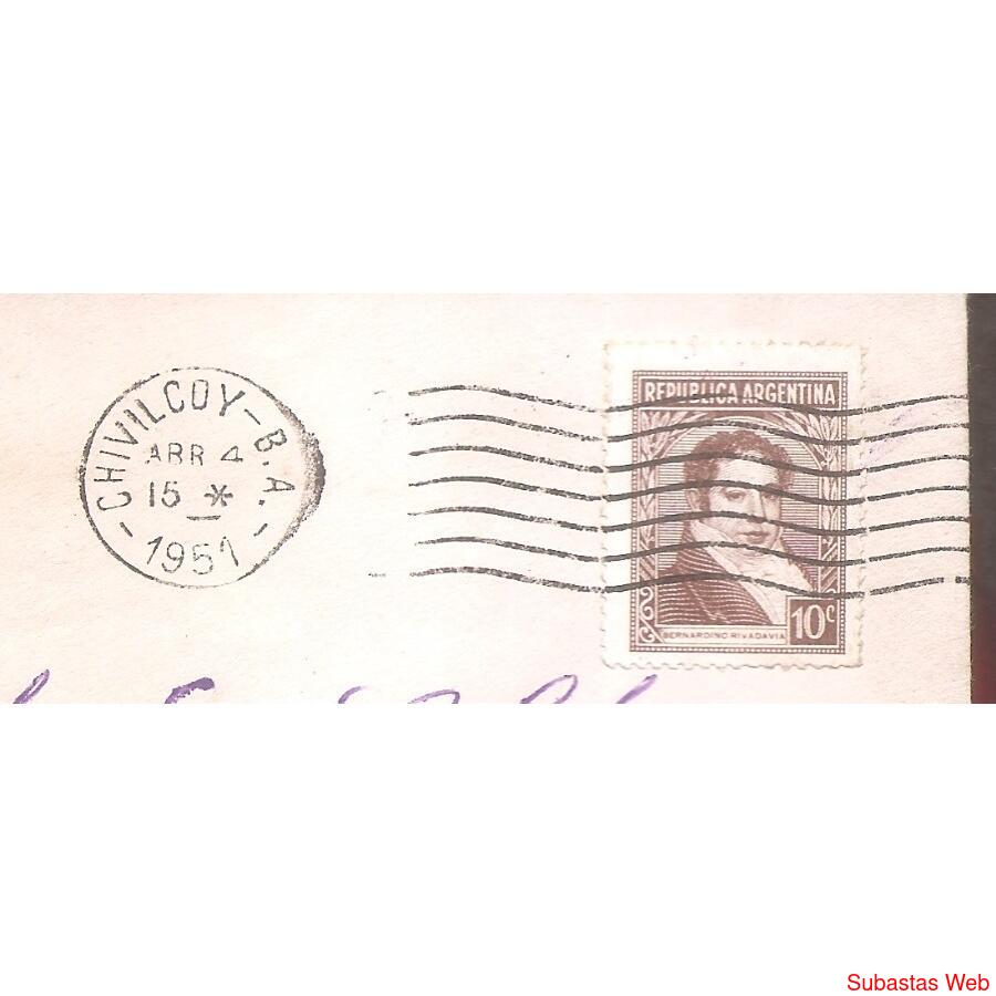SOBRE CIRCULADO EL 4 DE ABRIL DE 1951 DE CHIVILCOY -BUENOS AIRES- A BUENOS AIRES -CAPITAL- FRANQUEO: PROCERES Y RIQUEZAS: RIVADAVIA DE 10ctvs: . , MATASELLO DE CHIVILCOY CON BANDELETA DE LINEAS ONDULADAS, , AL DORSO MATASELLO BANDELETA DE BUENOS AIRES