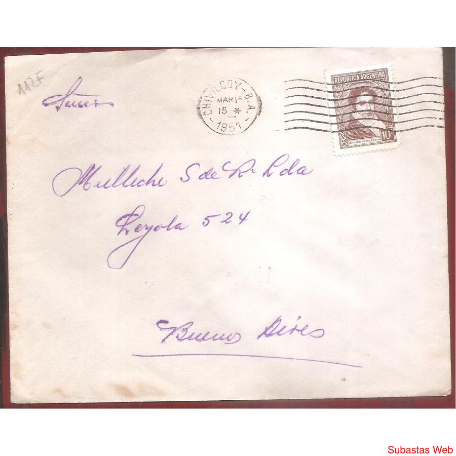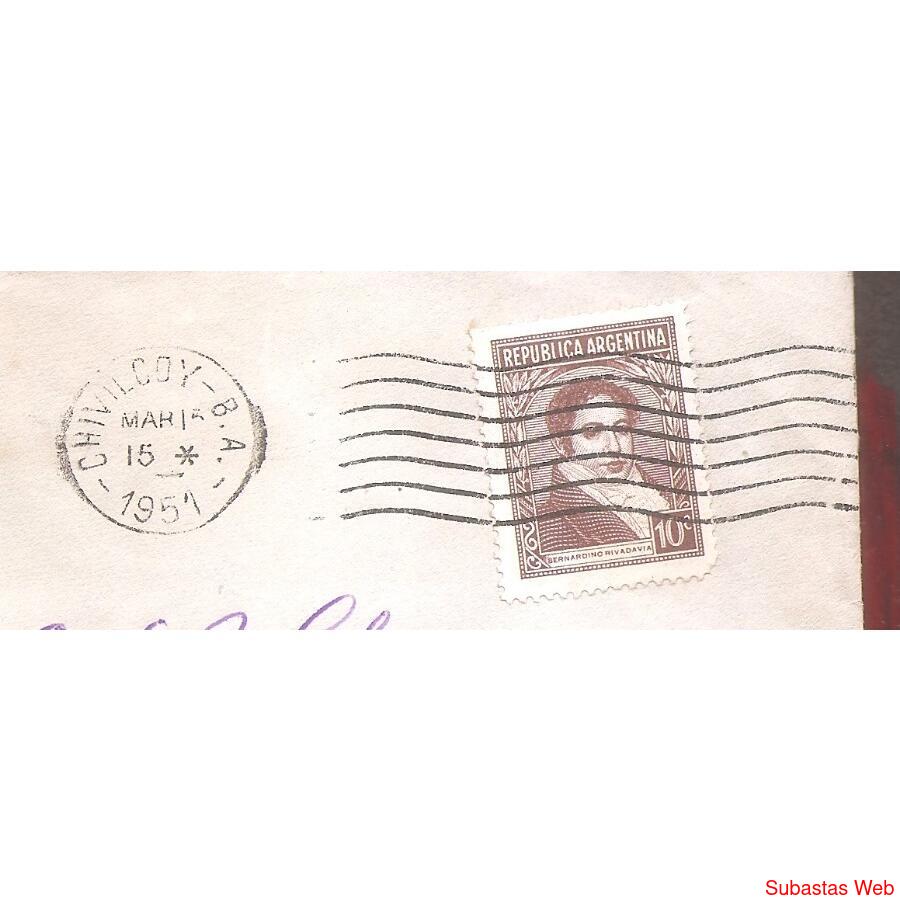 SOBRE CIRCULADO EL 15 DE MARZO DE 1951 DE CHIVILCOY -BUENOS AIRES- A BUENOS AIRES -CAPITAL- FRANQUEO: PROCERES Y RIQUEZAS: RIVADAVIA DE 10ctvs: , MATASELLO DE CHIVILCOY CON BANDELETA DE LINEAS ONDULADAS, , AL DORSO MATASELLO DE BUENOS AIRES CON BANDELETA