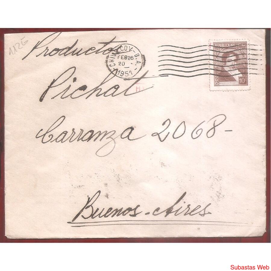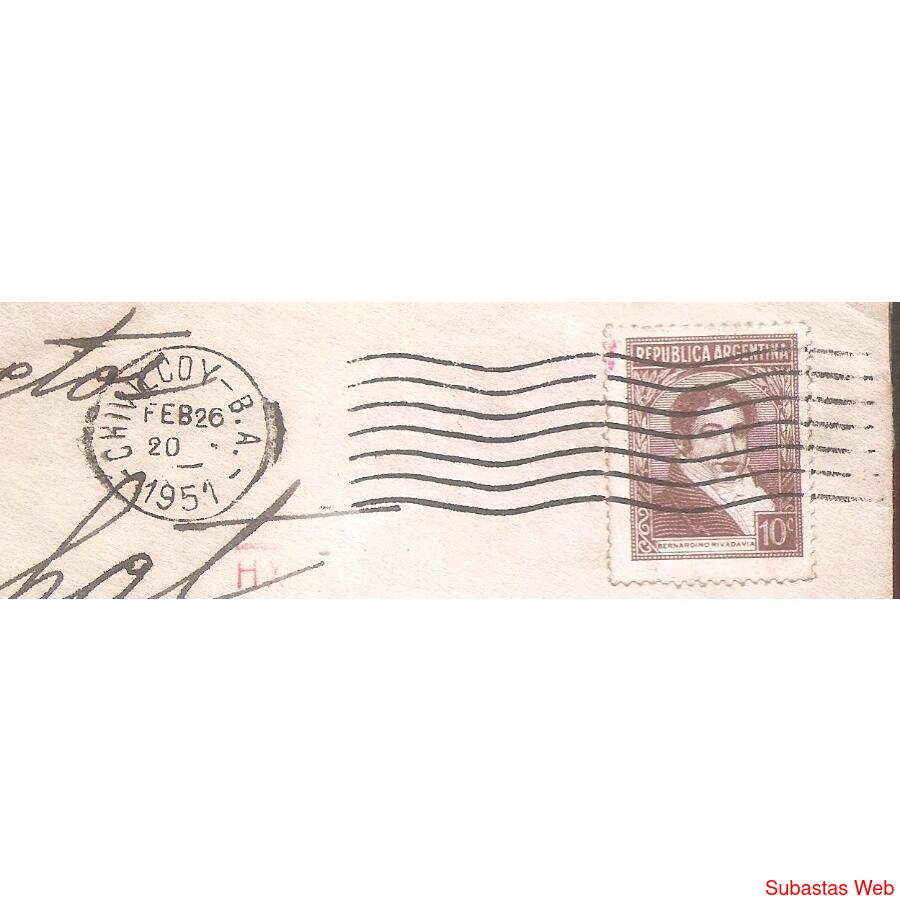 SOBRE CIRCULADO EL 26 DE FEBRERO DE 1951 DE CHIVILCOY -BUENOS AIRES- A BUENOS AIRES -CAPITAL- FRANQUEO: PROCERES Y RIQUEZAS: RIVADAVIA DE 10ctvs: , MATASELLO DE CHIVILCOY CON BANDELETA DE LINEAS ONDULADAS, , AL DORSO MATASELLO DE BUENOS AIRES CON BANDELETA