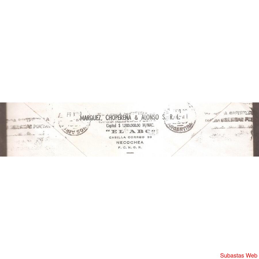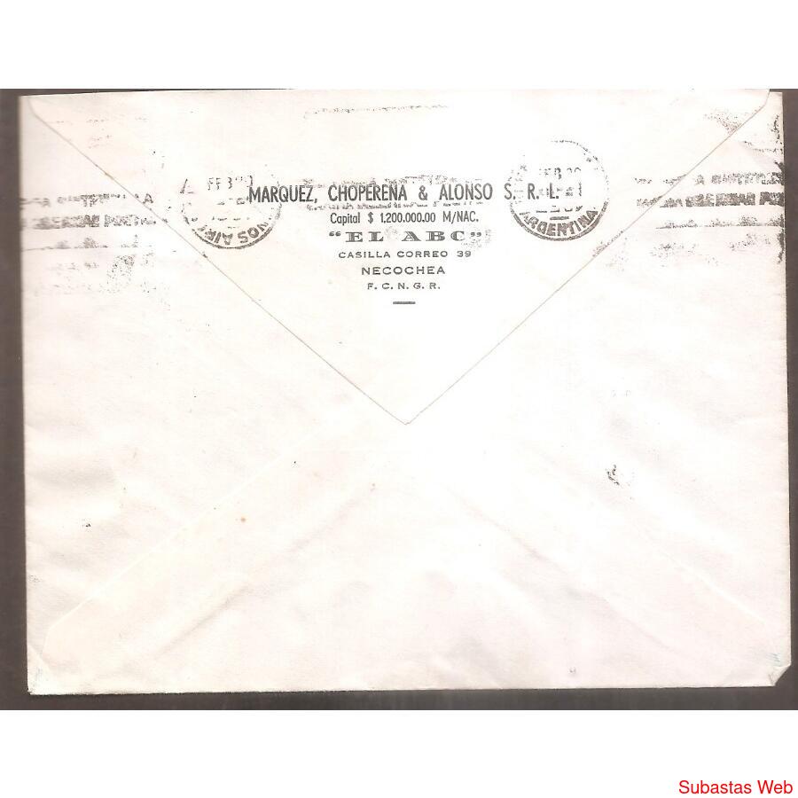 SOBRE CIRCULADO EL 20 DE FEBRERO DE 1957 DE NECOCHEA A BUENOS AIRES -CAPITAL, FRANQUEO: SAN MARIN DE 40ctvs DE PROCERES Y RIQUEZAS, MATASELLO DE NECOCHEA, AL DORSO MATASELLO CON BANDELETA DE BUENOS AIRES