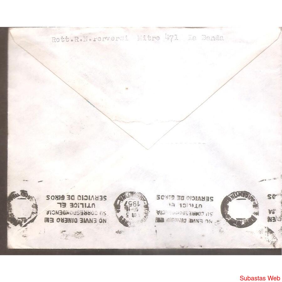 SOBRE CIRCULADO EL 1 DE ABRIL DE 1957 DE LA BANDA SANTIAGO DEL ESTERO A BUENOS AIRES -CAPITAL, FRANQUEO: SAN MARIN DE 40ctvs Y RIVADAVIA DE 10ctvs.DE PROCERES Y RIQUEZAS, MATASELLO DE LA BANDA, AL DORSO MATASELLO CON BANDELETA DE BUENOS AIRES