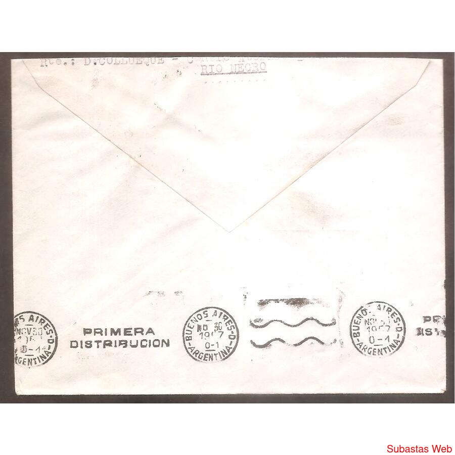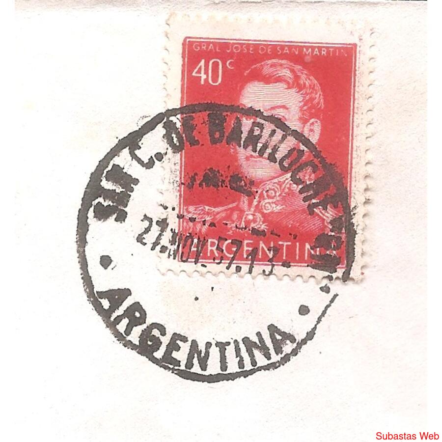 SOBRE CIRCULADO EL 27 DE NOVIEMBRE DE 1957 DE SAN CARLOS DE BARILOCHE -RIO NEGRO - A BUENOS AIRES -CAPITAL, FRANQUEO: SAN MARTIN DE 40ctvs DE PROCERES Y RIQUEZAS, MATASELLO DE SAN CARLOS DE BARILOCHE, AL DORSO MATASELLO CON BANDELETA DE BUENOS AIRES