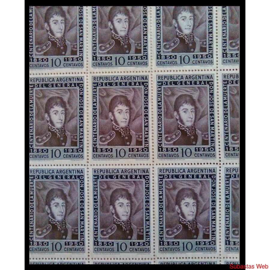ARGENTINA. GJ 976. "CENTENARIO DE LA MUERTE DE SAN MARTÍN 10 centavos" PLANCHA COMPLETA NUEVA SIN GOMA x 50 SELLOS CON TODOS SUS BORDES COMPLETOS