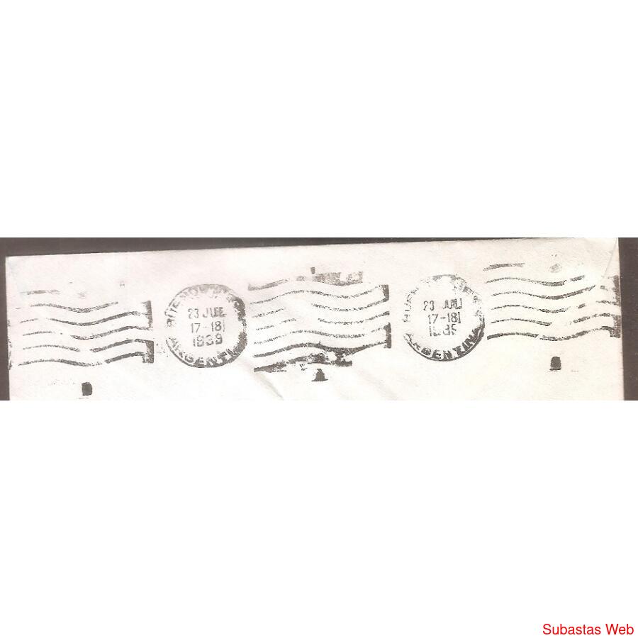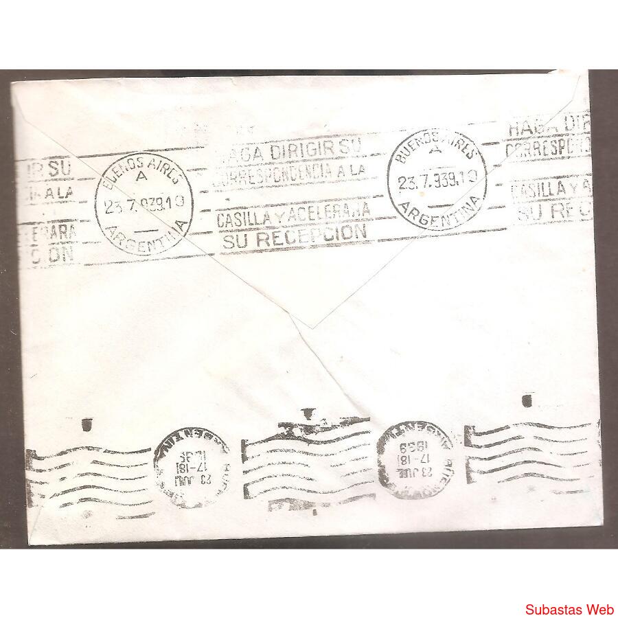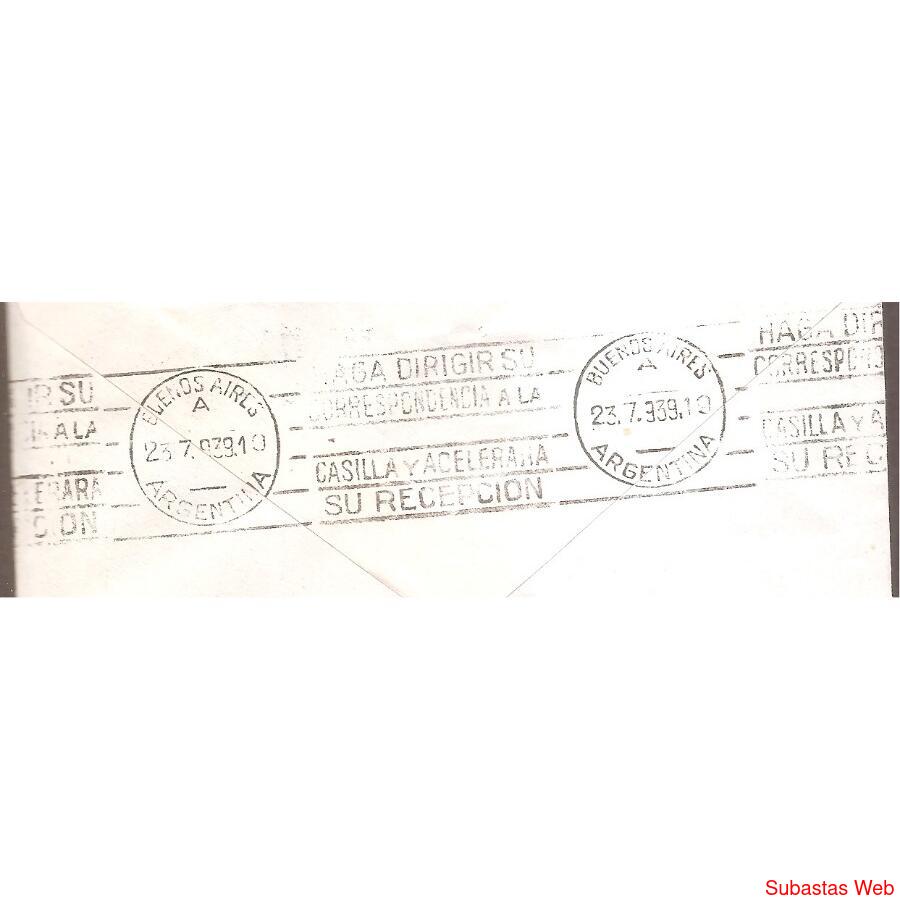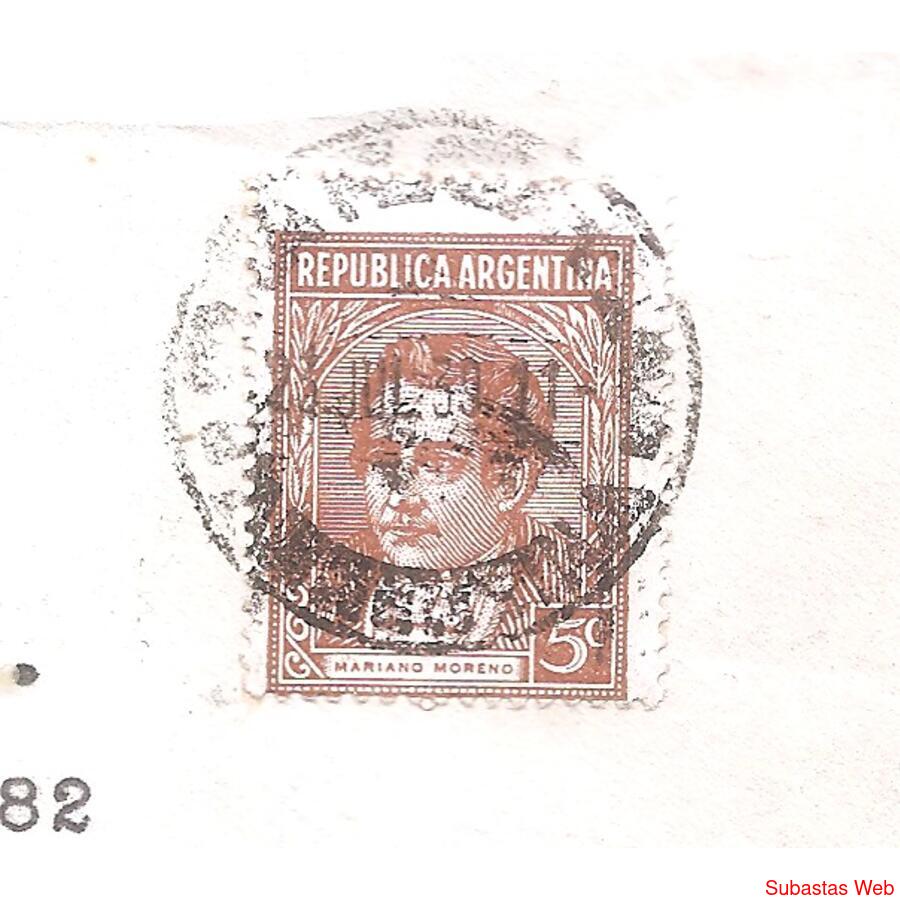 SOBRE CIRCULADOEL 23 DE JULIO DE 1939 DE NO SE DISTINGUE CIUDAD A BUENOS AIRES A CAPITAL FEDERAL FRANQUEO: PROCERES Y RIQUEZAS, MORENO DE 5ctvs. Matasellos al frente CIUDAD ILEGIBLE AL DORSO 2 BUENOS MATASELLO BUENOS AIRES CON BANDELETA