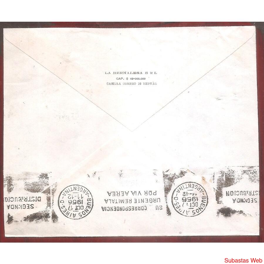 SOBRE CIRCULADO EL 16 DE OCTUBRE DE 1956 DE BERNAL -BUENOS AIRES- A (SOBRE CON VENTADA:LA DIRECCION ESTABA EN EL DOCUMENTO ENVIADO) , FRANQUEO: 2 SELLOS SAN MARTIN DE 20ctvs DE PROCERES Y RIQUEZAS, MATASELLO DE BERNAL, AL DORSO MATASELLO BANDELETA DE BUENOS AIRES