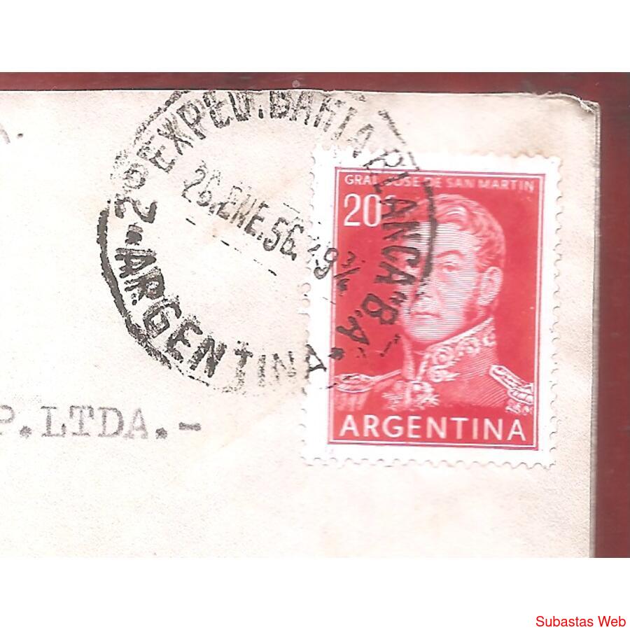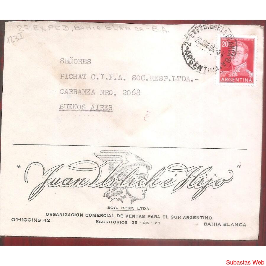 SOBRE CIRCULADO EL26 DE ENERO DE 1956 DE BAHIA BLANCA -BUENOS AIRES- A CAPITAL FEDERAL , FRANQUEO: PROCERES Y RIQUEZAS: SAN MARTIN DE 20ctvs., MATASELLO DE BAHIA BLANCA, AL DORSO NADA, SOBRE MEMBRETADO DE JUAN URLICH e HIJO