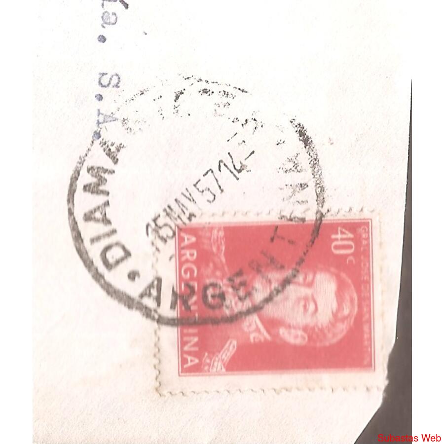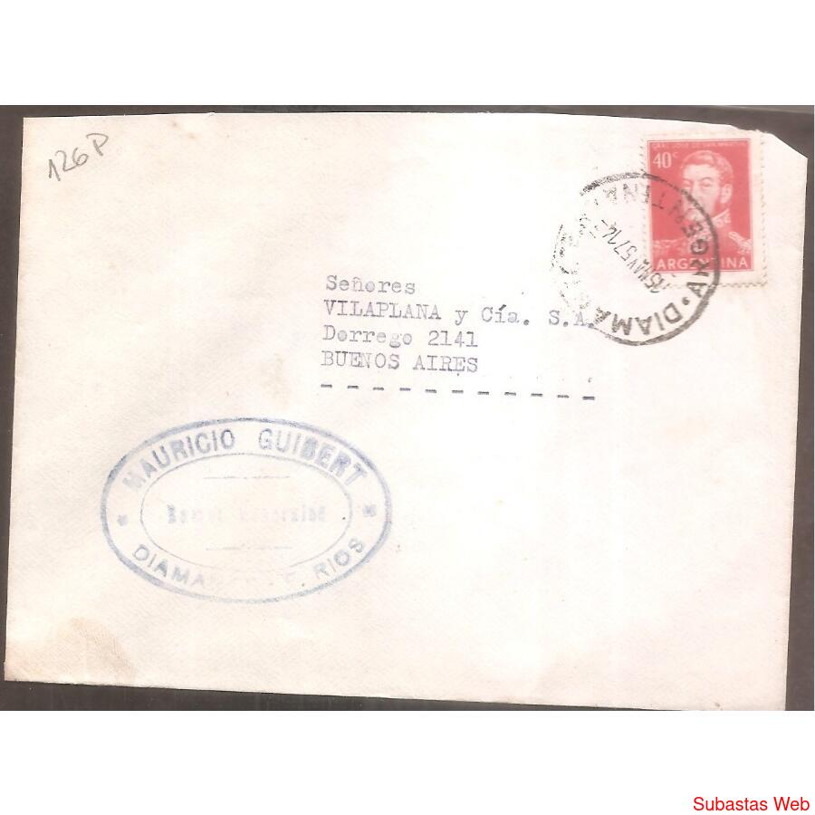 SOBRE CIRCULADO EL 15 DE MAYO DE 1957 DE DIAMENTE -ENTRE RIOS- A BUENOS AIRES CAPITAL, FRANQUEO: PROCERES Y RIQUEZAS: SAN MARTIN DE 40ctvs.., MATASELLO DE DIAMANTE HAY UN SELLO OVALADO DEL DESTINATARIO AL DORSO NADA