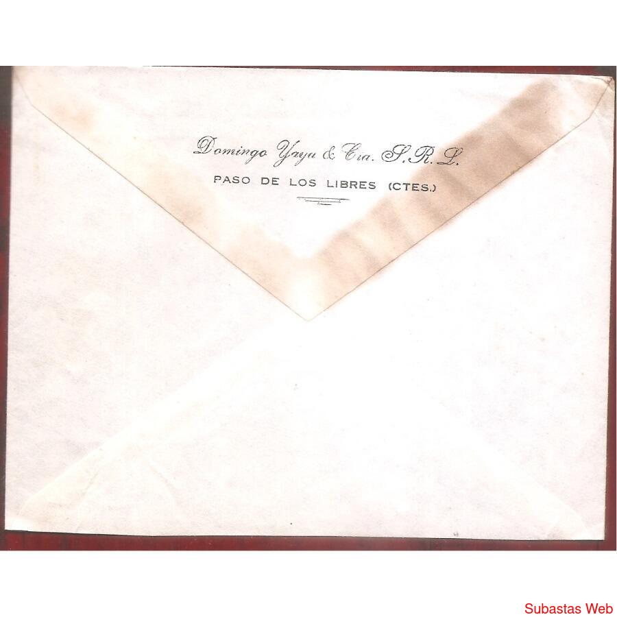 SOBRE CIRCULADO EL 23 DE MAYO DE 1957 DE PASO DE LOS LIBRES -CORRIENTES- A BUENOS AIRES CAPITAL, FRANQUEO: PROCERES Y RIQUEZAS: SAN MARTIN DE 40ctvs.., MATASELLO DE PASO DE LOS LIBRES, HAY UN SELLO OVALADO DEL DESTINATARIO AL DORSO REMITENTE IMPRESO