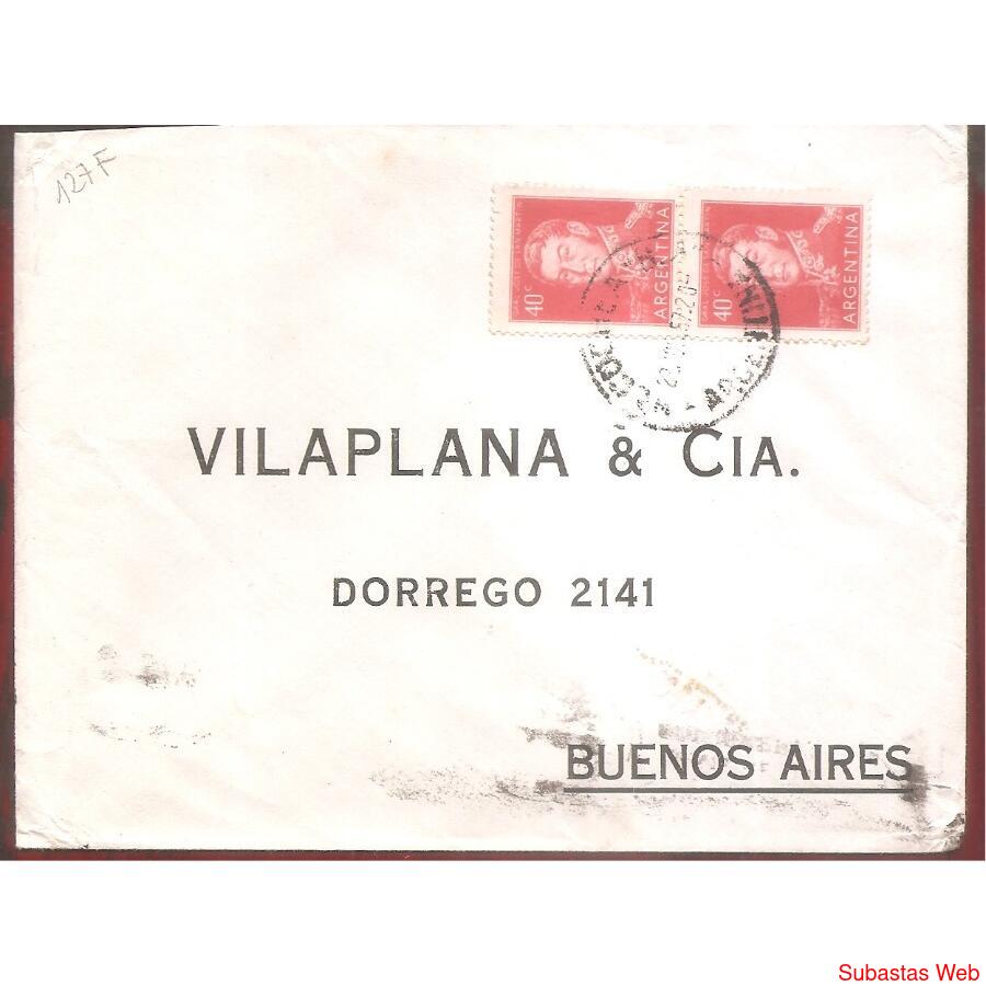 SOBRE CIRCULADO EL 22 DE JULIO 1957 DE NECOCHEA -BUENOS AIRES- A BUENOS AIRES -CAPITAL, FRANQUEO: 2 SELLOS DE SAN MARTIN DE 20ctvs. DE PROCERES Y RIQUEZAS, MATASELLO DE NECOCHEA, AL DORSO MATASELLO DE BUENOS AIRES CON BANDELETA, SOBRE MEMBRETADO: VILAPLANA & Cia
