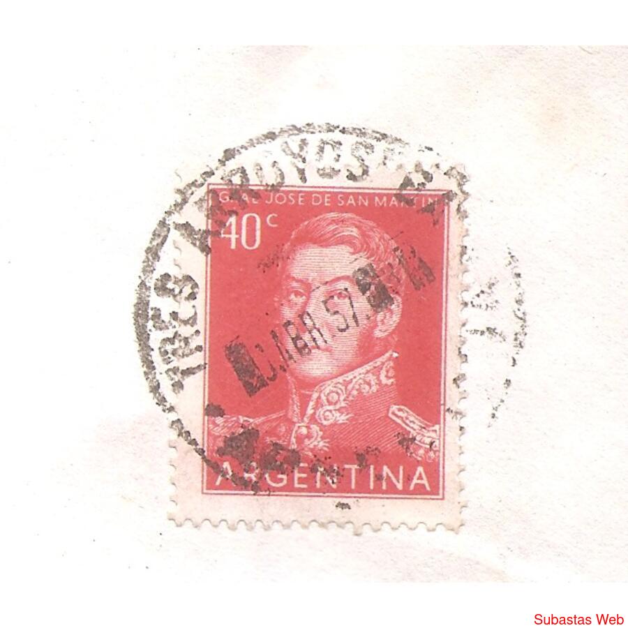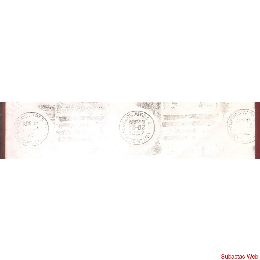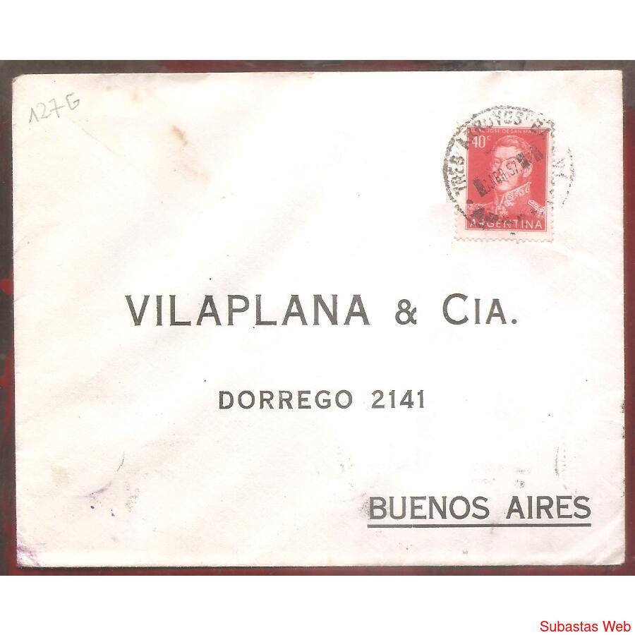 SOBRE CIRCULADO EL 11 DE ABRIL 1957 DE TRES ARROYOS -BUENOS AIRES- A BUENOS AIRES -CAPITAL, FRANQUEO: SAN MARTIN DE 20ctvs. DE PROCERES Y RIQUEZAS, MATASELLO DE TRES ARROYOS, AL DORSO MATASELLO DE BUENOS AIRES CON BANDELETA, SOBRE MEMBRETADO: VILAPLANA & Cia