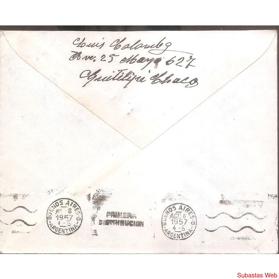 SOBRE CIRCULADO EL 4 DE AGOSTO DE 1957 DE QUITILIQUI -CHACO- A BUENOS AIRES CAPITAL FRANQUEO: 1 SELLOS DE SAN MARTIN DE 40ctvs. DE PROCERES Y RIQUEZAS, MATASELLO MUY BORROSO, AL DORSO MATASELLO DE BUENOS AIRES CON BANDELETA Y REMITENTE