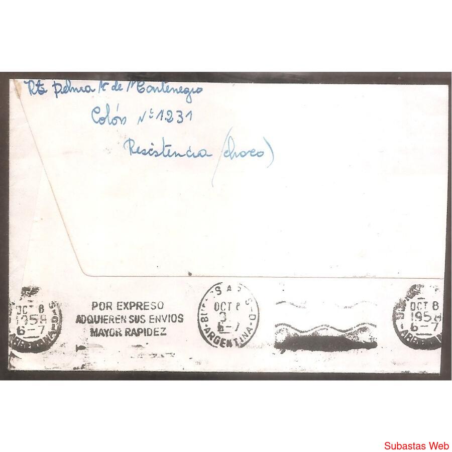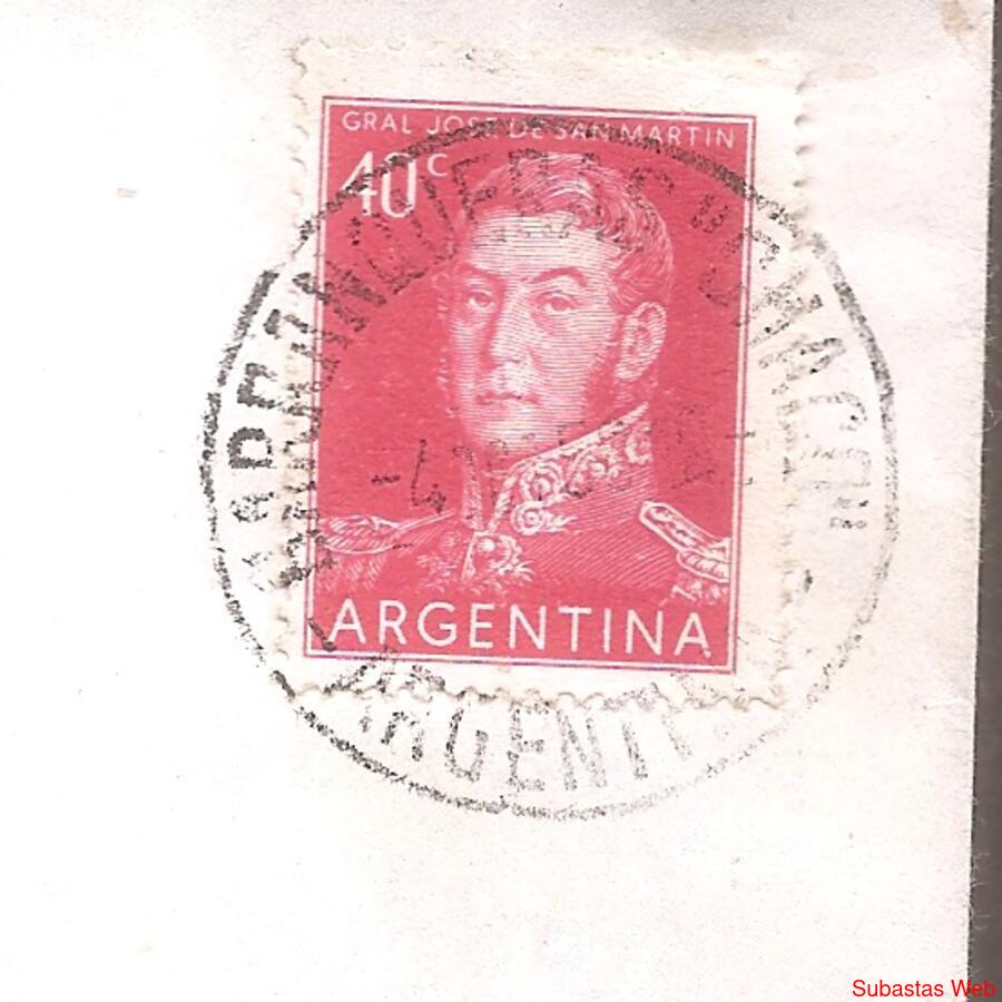 SOBRE CIRCULADO EN OCTUBRE DE 1958 DE BARRANQUERAS -CHACO- A BUENOS AIRES CAPITAL FRANQUEO: 1 SELLOS DE SAN MARTIN DE 40ctvs. DE PROCERES Y RIQUEZAS, MATASELLO MUY BORROSO DE BARRANQUERAS, AL DORSO MATASELLO DE BUENOS AIRES CON BANDELETA, Y REMITENTE
