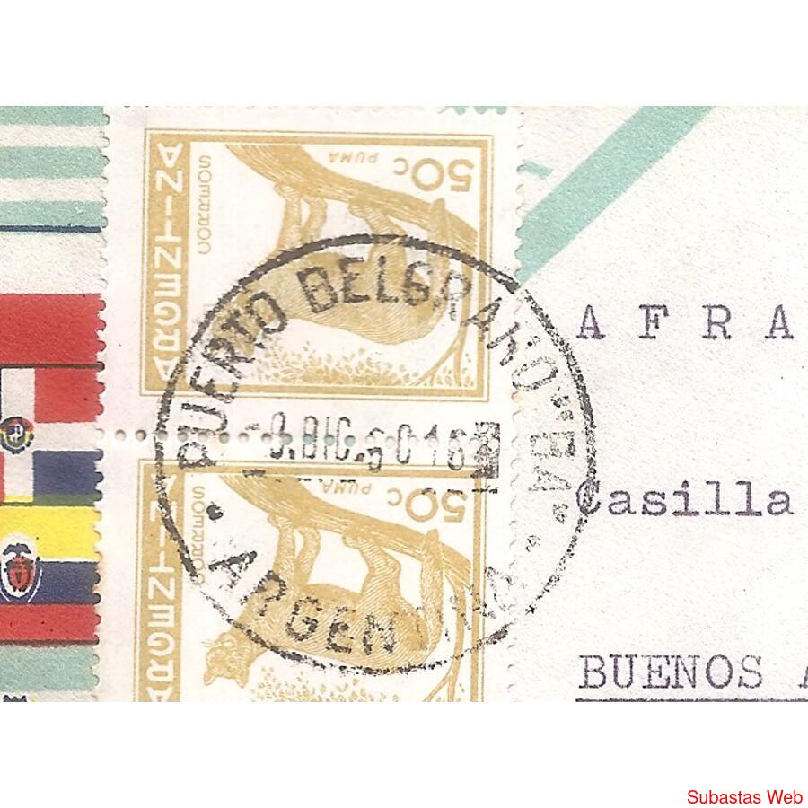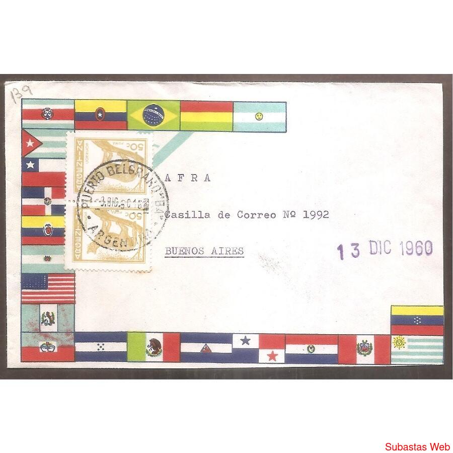SOBRE CIRCULADO EL 8 DE DICIEMBRE DE 1960, DE PUERTO BELGRANO -BUENOS AIRES A CAPITAL FEDERAL, FRANQUEO: 2 SELLOS PUMA DE PROCERES Y RIQUEZASA, MATASELLO DE PUERTO BELGRANO, AL DORSO REMITENTE, SOBRE DECORADO CON LAS BANDERAS DE AMERICA
