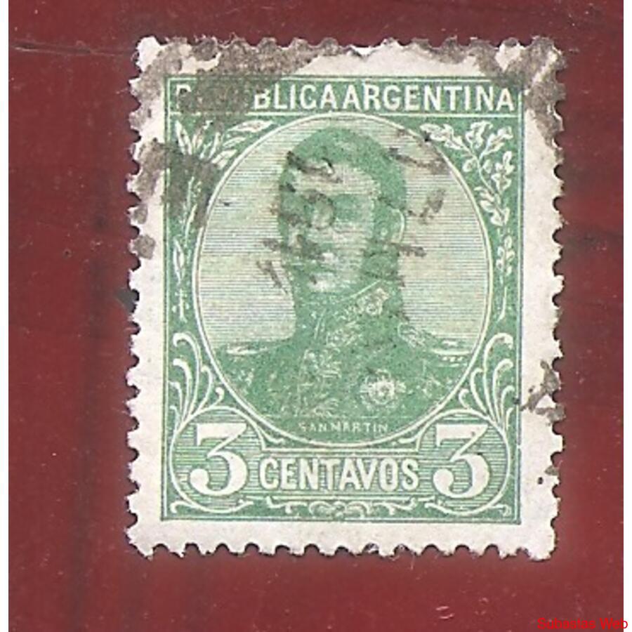 ARGENTINA 1908 SAN MARTIN EN OVALO CON FILIGRANA, DENTADO 13,5x12,5 USADA, NROCAT: MT 135