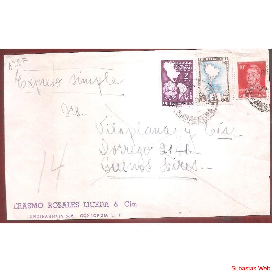 FRENTE DE SOBRE CIRCULADO EN EL AÑO 1957 DE CONCORDIA, ENTRE RIOD- A BUENOS AIRES -CAPITAL, FRANQUEO: CONFERENCIA ECONOMICA INTERAMERICANA, Y PROCERES Y RIQUEZAS: MAPA CON ANTARTIDA + SAN MARTIN DE 0,40 , MATASELLO DE CONCORDIA (BORROSO), NO HAY DORSO