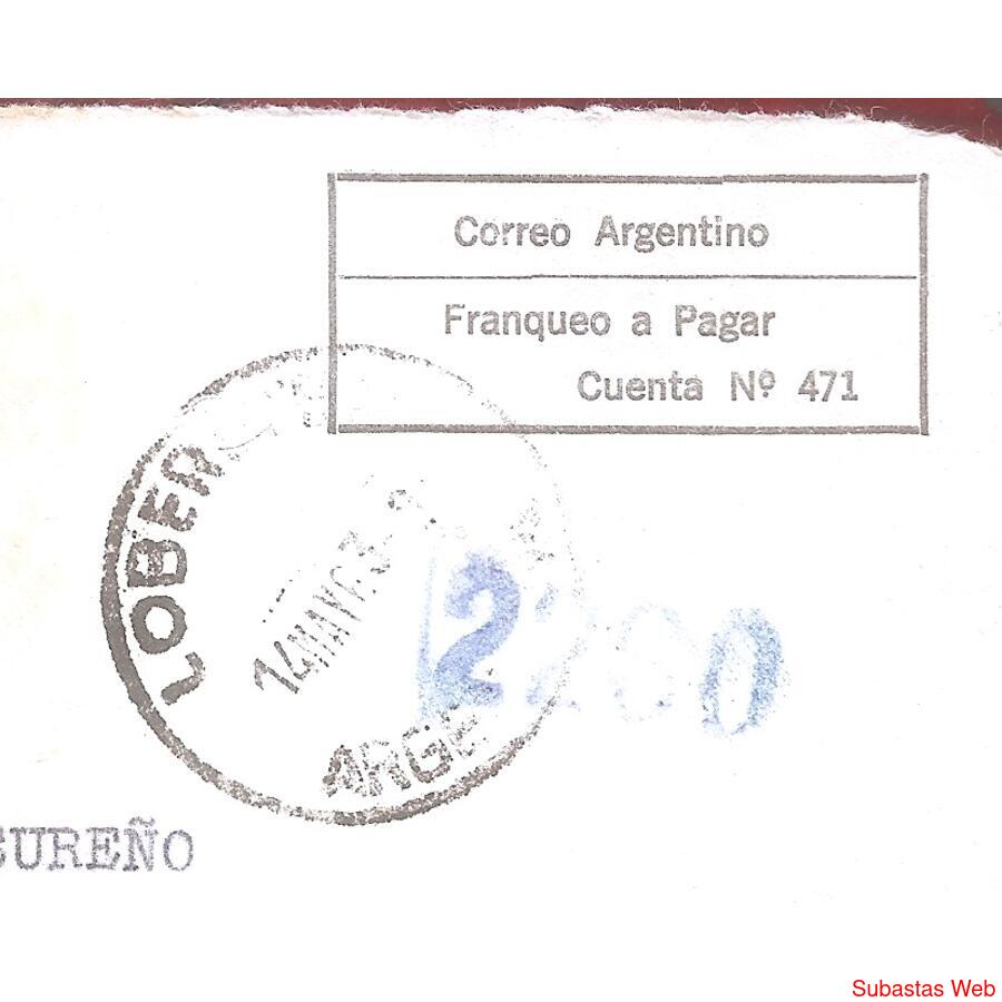FRENTE DE SOBRE CIRCULADO EL 14 DE MAYO DE 1963 DE LOBERIA - A BAHIA BLANCA- , FRANQUEO A PAGAR . MATASELLO DE LOBERIA, SOBRE MEMBRETADO DEL BANCO DE LA NACION ARGENTINA, SELLO DEL BANCO Y LEYENDAS DIVERSAS, NO HAY DORSO