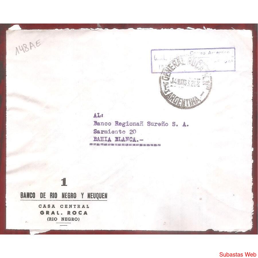FRENTE DE SOBRE CIRCULADO EL 14 DE MAYO DE 1963 DE GENERAL ROCA, RIO NEGRO - A BAHIA BLANCA - , FRANQUEO A PAGAR, MATASELLO DE GENERAL ROCA , SOBRE MEMBRETADO DEL BANCO DE RIO NEGRO Y NEUQUEN NO HAY DORSO