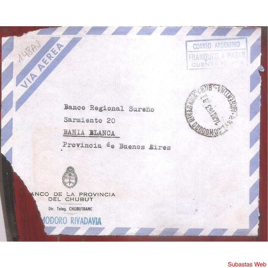 FRENTE DE SOBRE CIRCULADO EL 14 DE MAYO DE 1963 DE COMODORO RIVADAVIA, CHUBUT - A BAHIA BLANCA - , FRANQUEO A PAGAR MATASELLO DE COMODORO RIVADAVIA NO HAY DORSO, SOBRE MEMBRETADO DEL BANCO DE CHUBUT