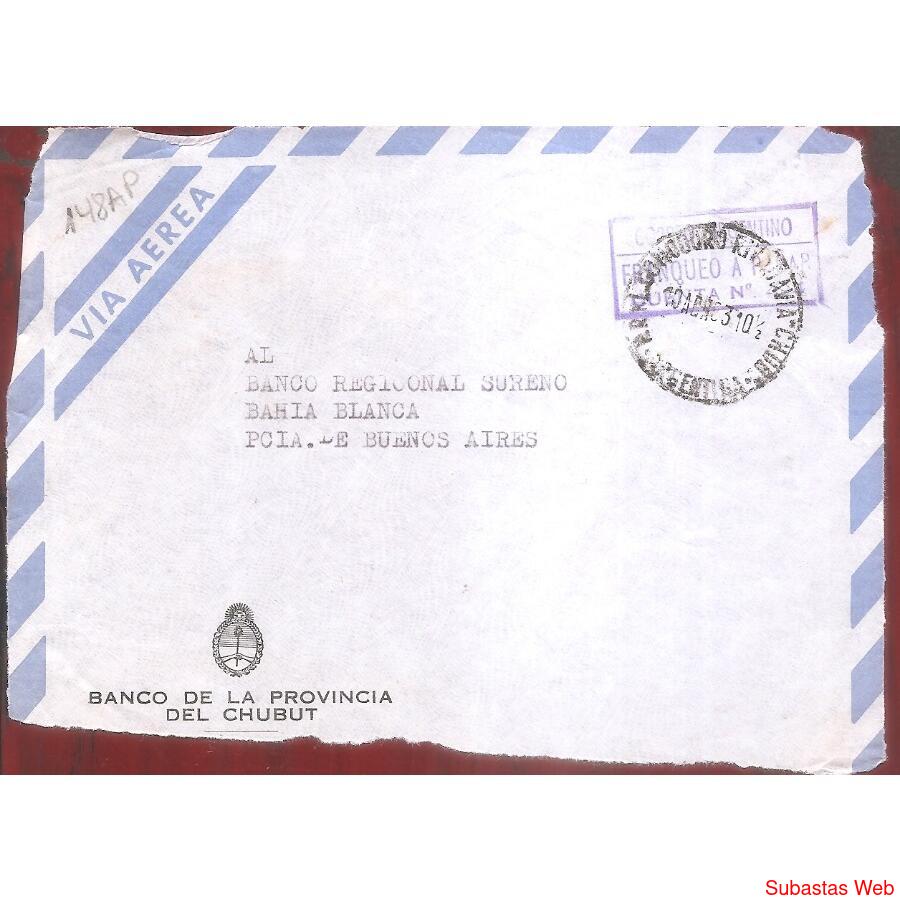 FRENTE DE SOBRE CIRCULADO EL 10 DE ABRIL DE 1963 DE COMODORO RIVADAVIA, CHUBUT - A BAHIA BLANCA - , FRANQUEO A PAGAR MATASELLO DE COMODORO RIVADAVIA NO HAY DORSO, SOBRE MEMBRETADO DEL BANCO ARGENTINO DE LA PROVINCIA DE CHUBUT