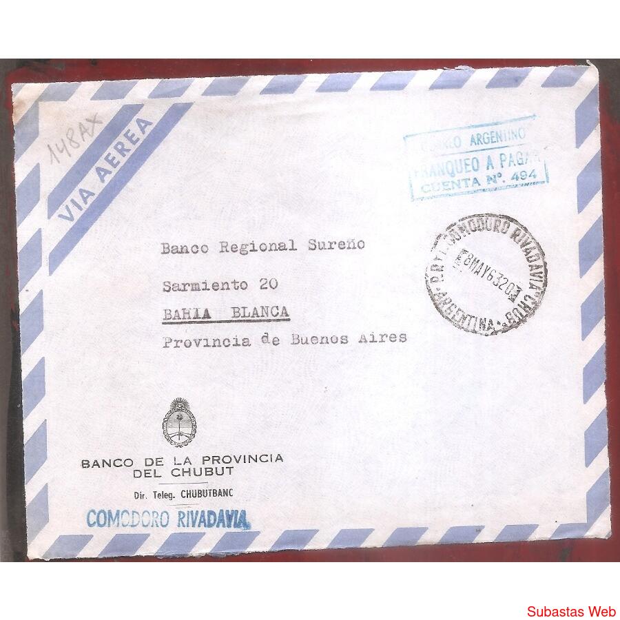 FRENTE DE SOBRE CIRCULADO EL 8 DE MAYO DE 1963 DE COMODORO RIVADAVIA, CHUBUT - A BAHIA BLANCA - , FRANQUEO A PAGAR MATASELLO DE COMODORO RIVADAVIA NO HAY DORSO, SOBRE MEMBRETADO DEL BANCO DE CHUBUT