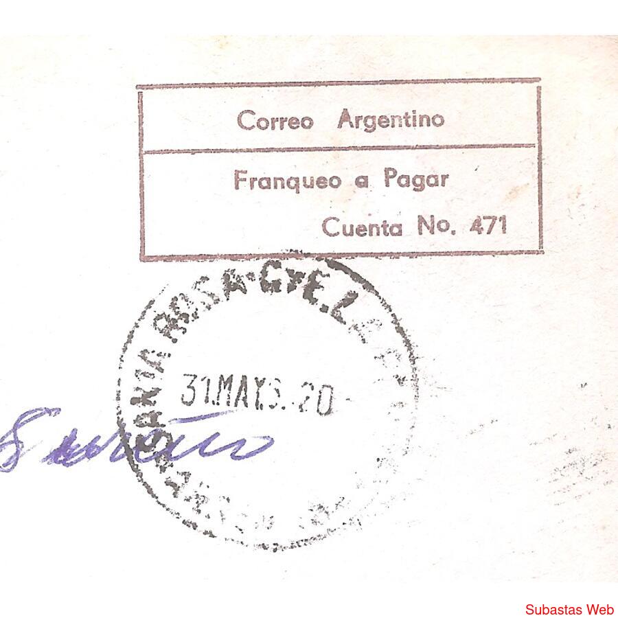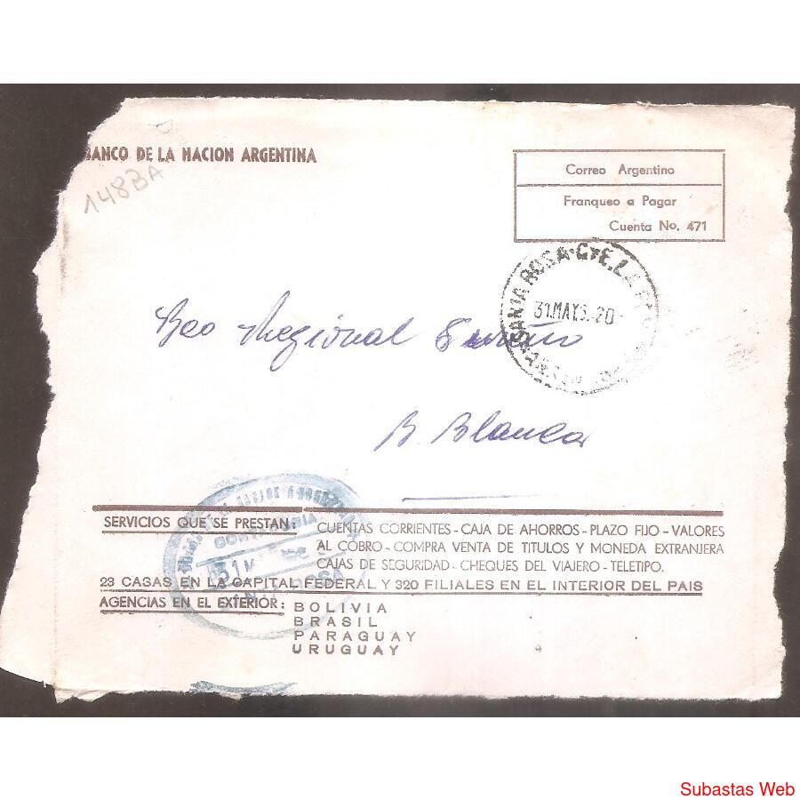 FRENTE DE SOBRE CIRCULADO EL 31 DE MAYO DE 1963 DE SANTA ROSA, LA PAMPA - A BAHIA BLANCA - , FRANQUEO A PAGAR MATASELLO DESANTA ROSA NO HAY DORSO, SOBRE MEMBRETADO DEL BANCO DE LA NACION ARGENTINA