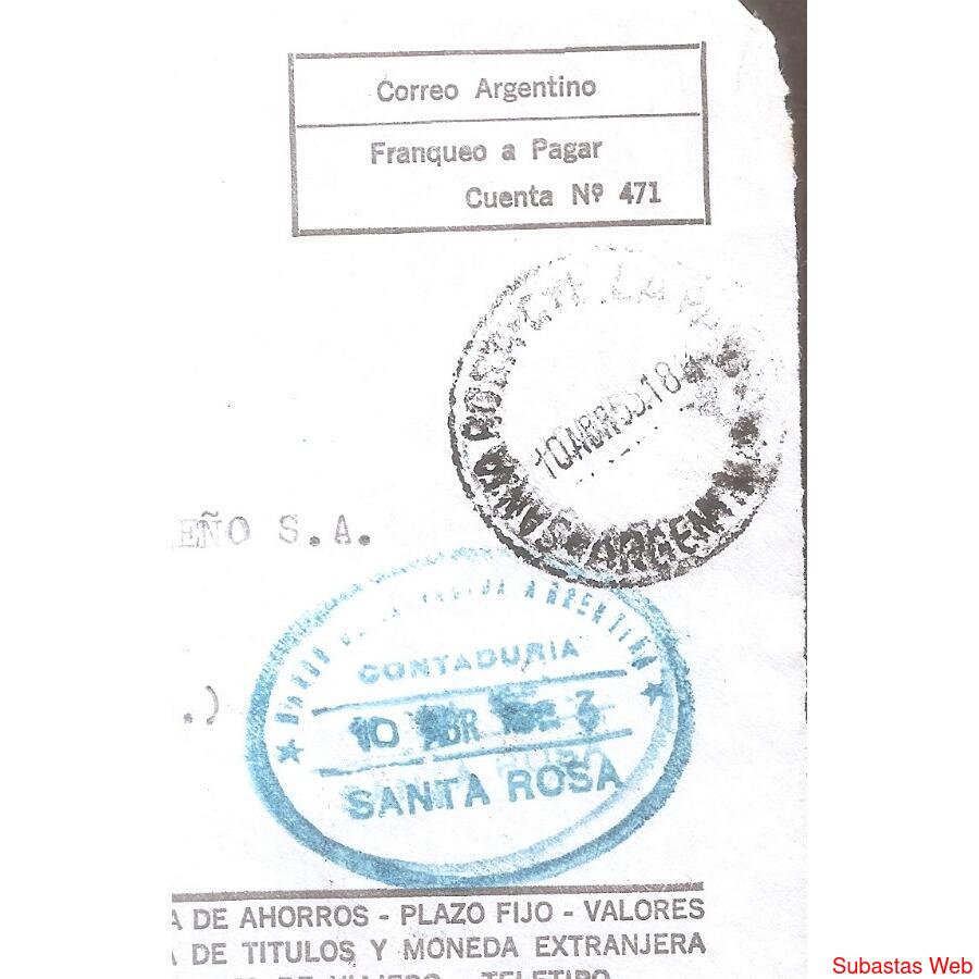 FRENTE DE SOBRE CIRCULADO EL 10 DE ABRIL DE 1963 DE SANTA ROSA, LA PAMPA - A BAHIA BLANCA - , FRANQUEO A PAGAR MATASELLO DE SANTA ROSA, NO HAY DORSO, SOBRE MEMBRETADO DEL BANCO DE LA NACION