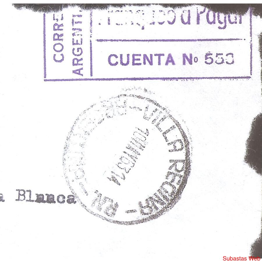 FRENTE DE SOBRE CIRCULADO EL 10 DE MAYO DE 1963 DE VILLA REGINA -RIO NEGRO - A BAHIA BLANCA- , FRANQUEO A PAGAR . MATASELLO DE VILLA REGINA , SOBRE MEMBRETADO EL BANCO DE RIO NEGRO NO HAY DORSO