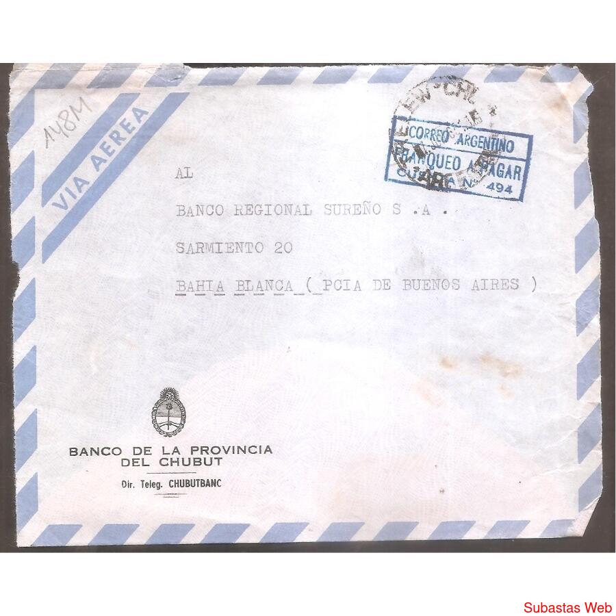 FRENTE DE SOBRE CIRCULADO EL 7 DE JUNIO DE 1963 DE TRELEW CHUBUT - A BAHIA BLANCA- , SOBRE MEMBRETADO DEL BANCO DE LA PROVINCIA DE CHUBIT, FRANQUEO A PAGAR . MATASELLO DE TRELEW NO HAY DORSO