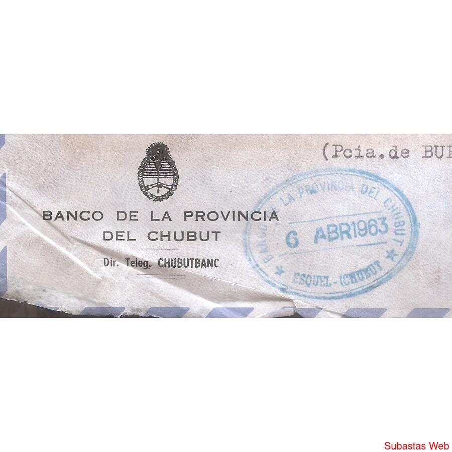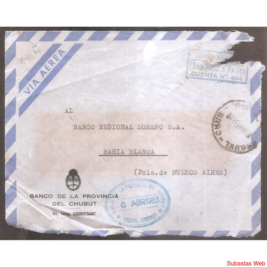 FRENTE DE SOBRE CIRCULADO EL 6 DE ABRIL DE 1963 DE ESQUEL CHUBUT - A BAHIA BLANCA- , SOBRE MEMBRETADO DEL BANCO DE LA PROVINCIA DE CHUBIT, FRANQUEO A PAGAR . MATASELLO DE ESQUEL HAY OTRO SELLO DEL BANCO NO HAY DORSO